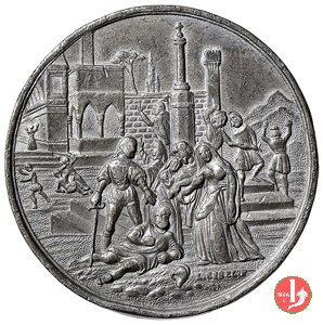 Ritrovamento del corpo Raffaello 1833 Obverse: RAPHAEL _ SANCTIVS. busto a sx con lunghi capelli e camicia Arcata con ossa in esergo: ALIT POSTERITAS = • MDCCCXXXIII • = - = L. DEPOLETTI F. | |