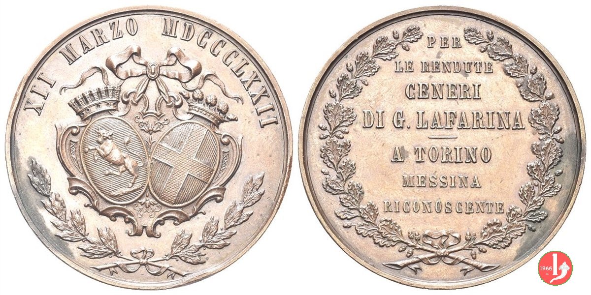 Ceneri di Giuseppe La Farina 1872 Obverse: XII MARZO MDCCCLXXII Stemmi affiancati di Torino e di Messina coronati e legati da nastro su rami d'alloro decussati | |