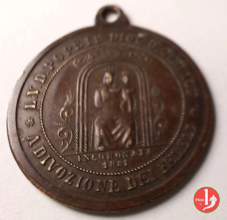 B. V. del Rosario 1883 Obverse: B. V. M. DEL _ SS. ROSARIO la B. V. coronata, in piedi, di fronte, su crescente lunare, tra nubi, regge Bambino coronato e corona del Rosario | |