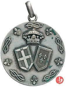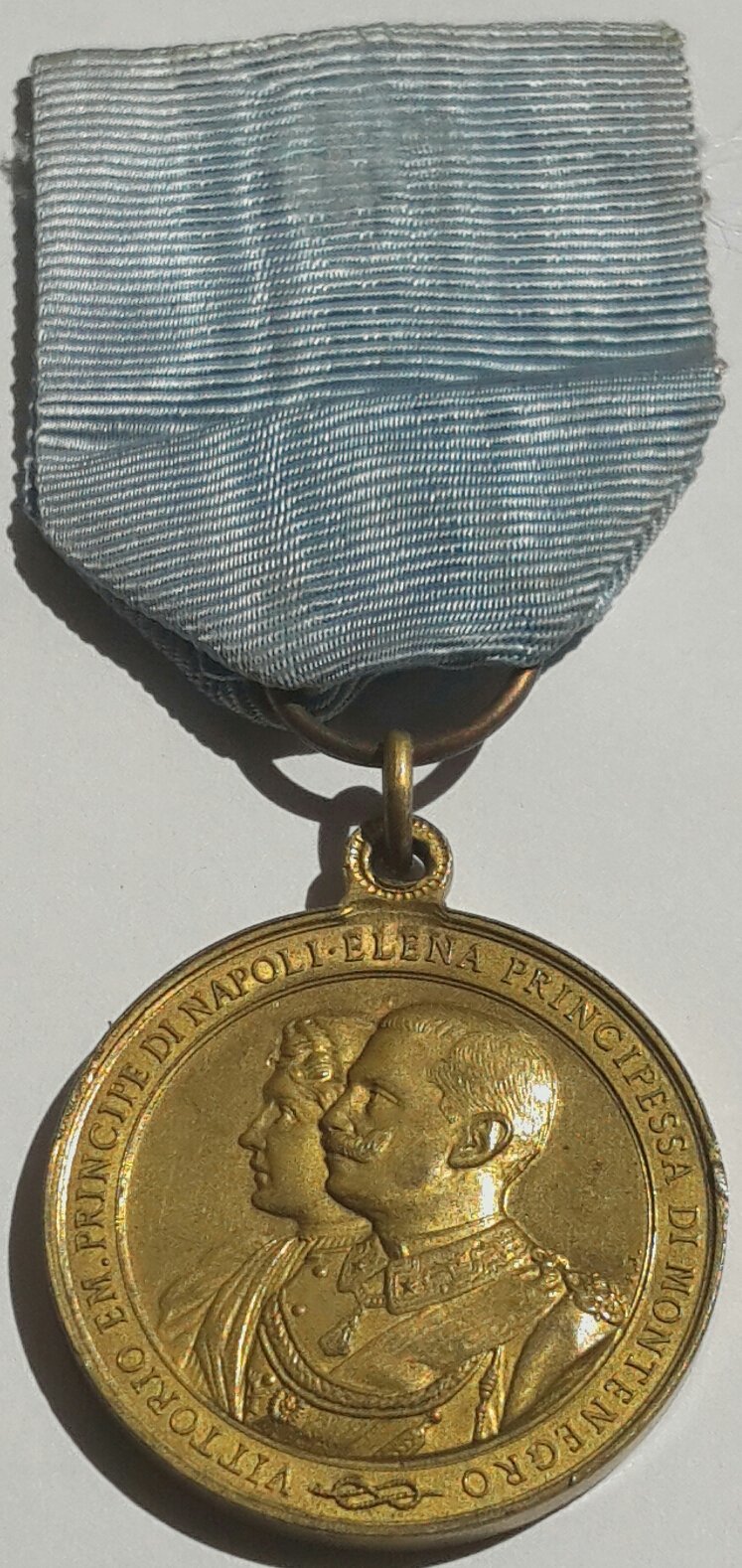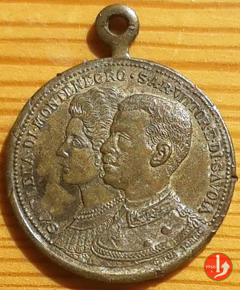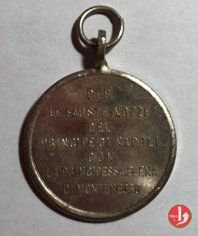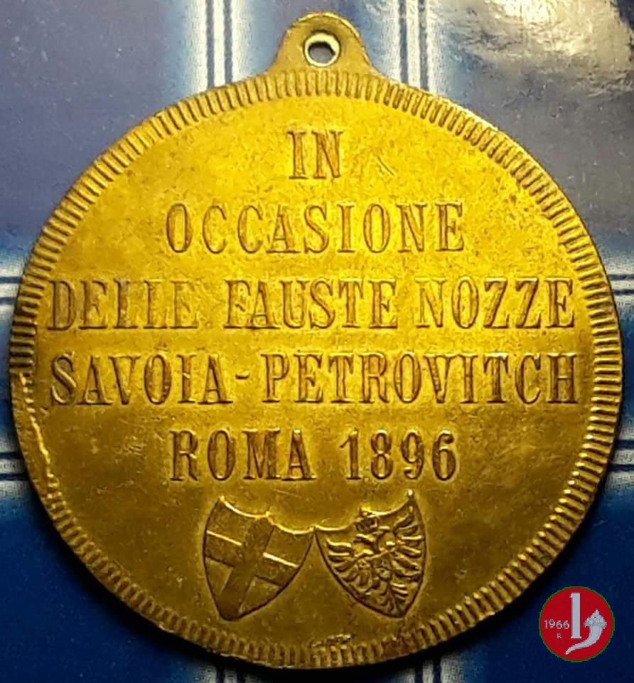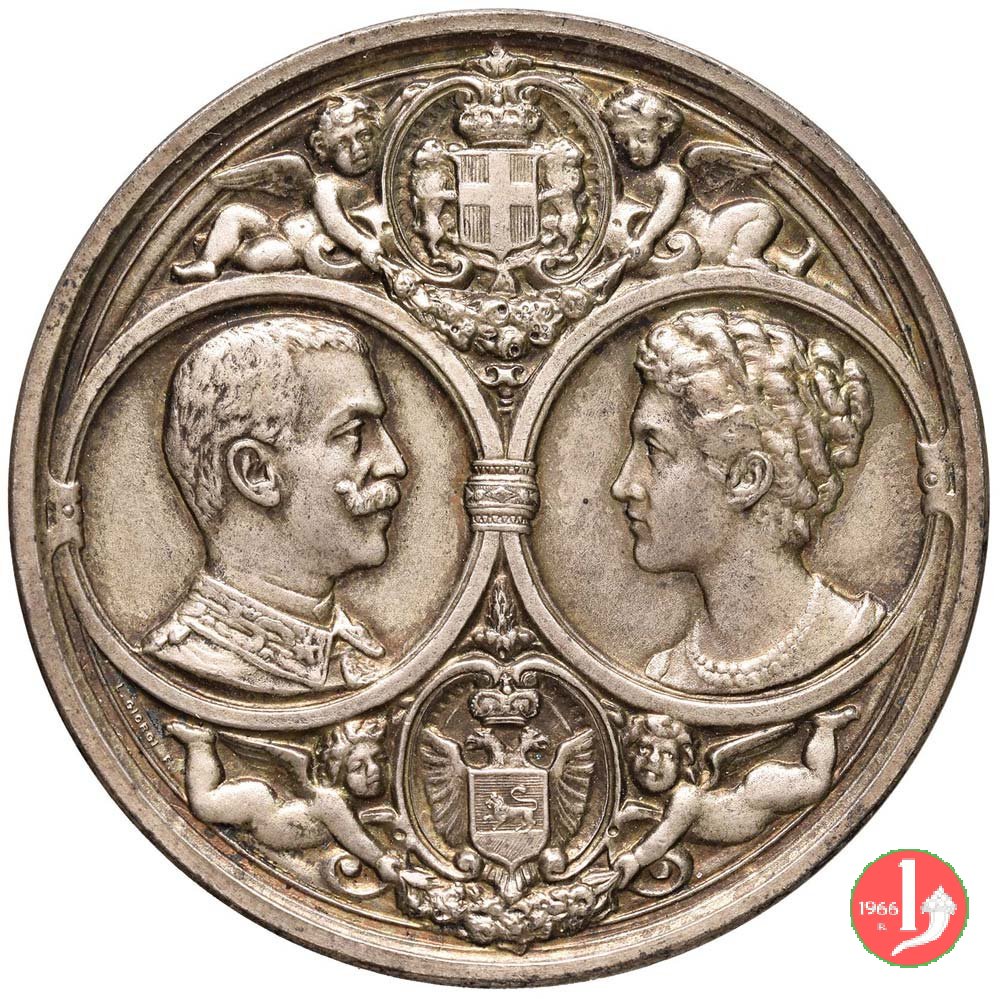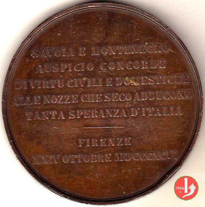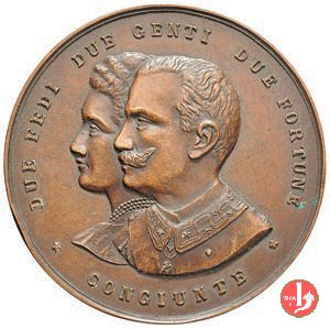 Nozze con Elena del Montenegro 1896 Dritto: entro cornici circolari legate da anello: busti affrontati di Vittorio Emanuele III con divisa militare e da Elena del Montenegro con doppia collana di perle in alto: Stemma coronato dei Savoia sorretto da leoni rampanti e incorniciato da due volute e da festone floreale retti da due putti alati in basso: Stemma coronato del Montenegro con aquila bicipite e contenuto da due volute e da festone floreale retti da due putti alati in basso a sx: L. GIORGI F. | |