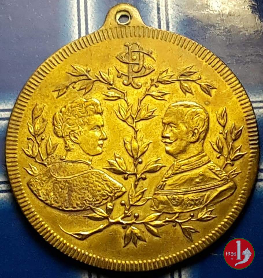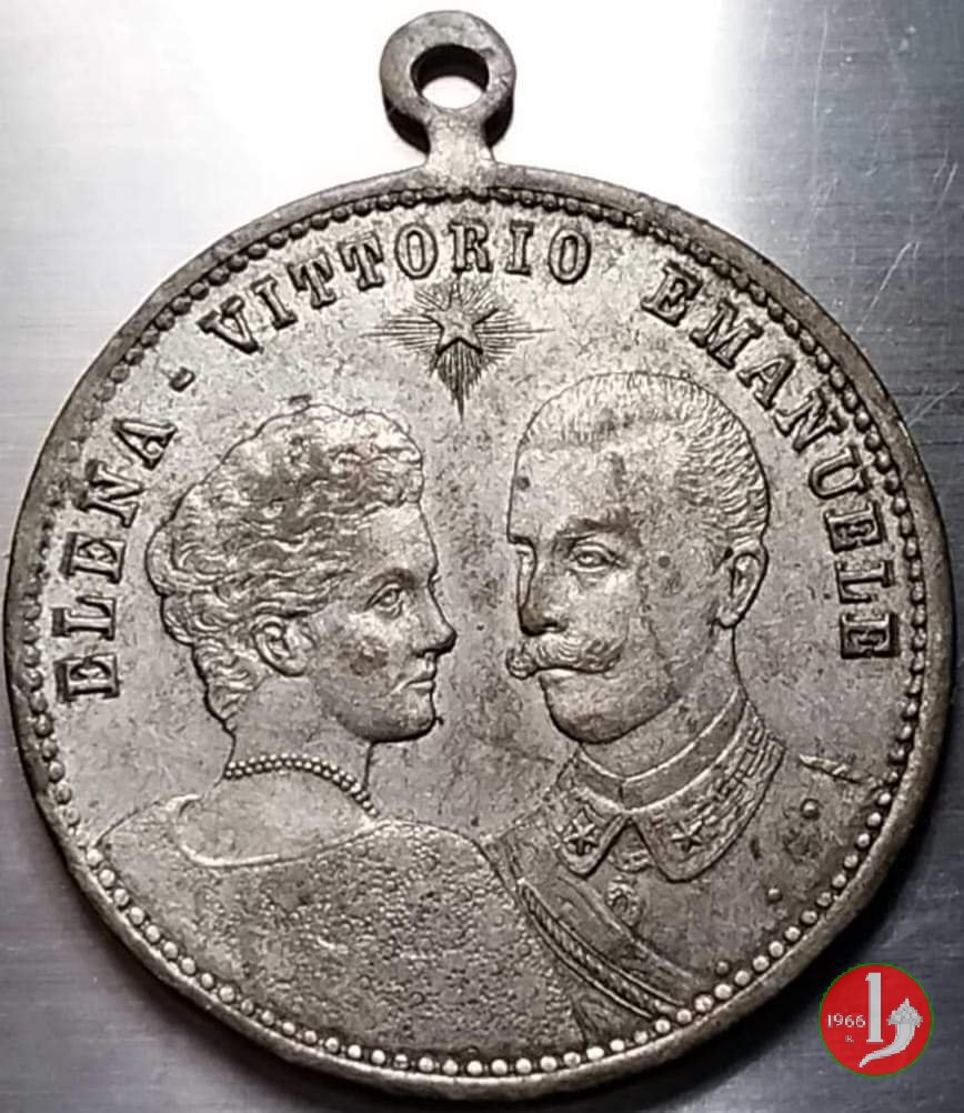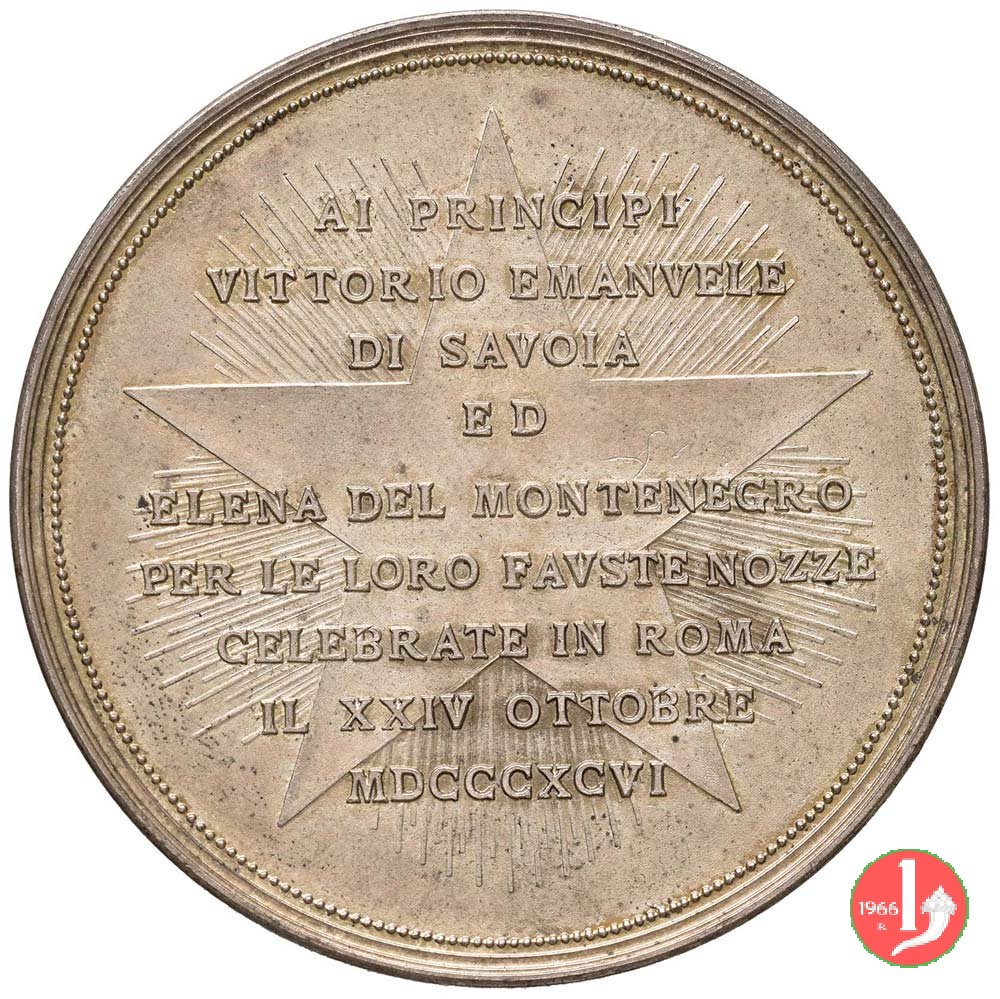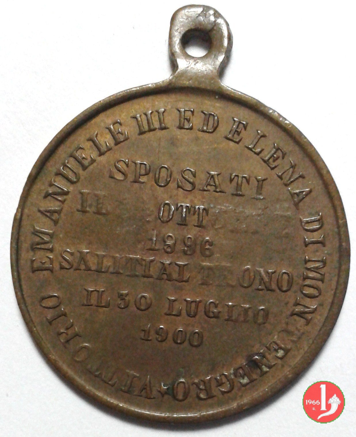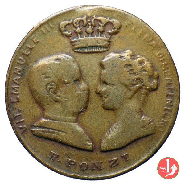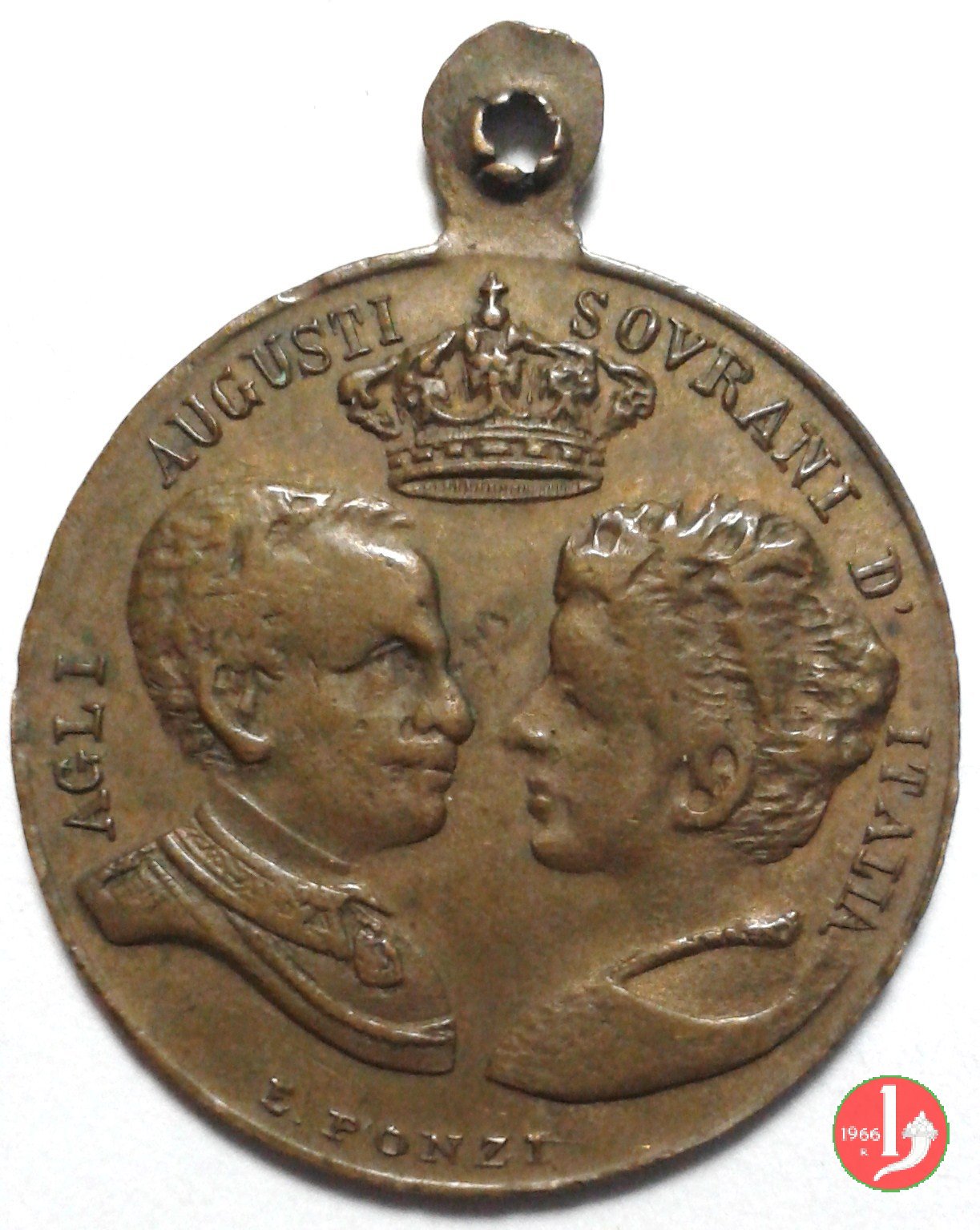Ascesa al Trono Dritto: AGLI _ AUGUSTI _ SOVRANI D' _ ITALIA busti affrontati sormontati da corona in basso: F. PONZI nel campo: SPOSATI = IL 24 OTTOBRE = 1896 = SALITI AL TRONO = IL 30 LUGLIO = 1900 | |