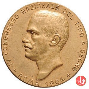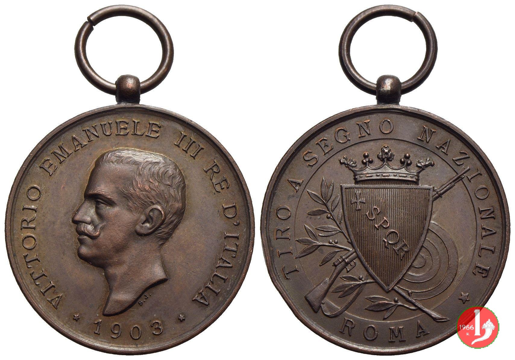 Tiro a Segno Nazionale Roma 1903 Dritto: VITTORIO EMANUELE III RE D'ITALIA = * 1903 * testa a sx sotto: S.J. Scudo di Roma SPQR coronato su baionetta, bersaglio e ramo d'alloro | |