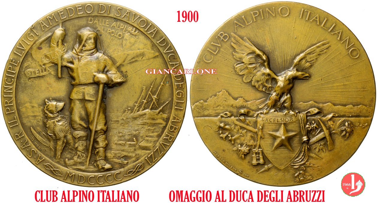 Luigi Amedeo di Savoia Duca degli Abruzzi 1900 Dritto: A S.A.R. IL PRINCIPE LUIGI AMEDEO DI SAVOIA DUCA DEGLI ABRVZZI = MDCCCC in alto: DALLE ALPI = AL POLO Stemma Savoia coronato il Principe in piedi e di fronte regge bandiera con nastro su cui: STELLA POLARE in basso a sx: cane a dx sullo sfondo: il veliero Stella Polare in basso a sx: EB MOD. Aquila raggiante volta di 3/4 a dx e con ali spiegate su stemma del CAI su picco, stelle alpine e binocolo in basso a sx: JOHNSON MILANO CA INC. | |