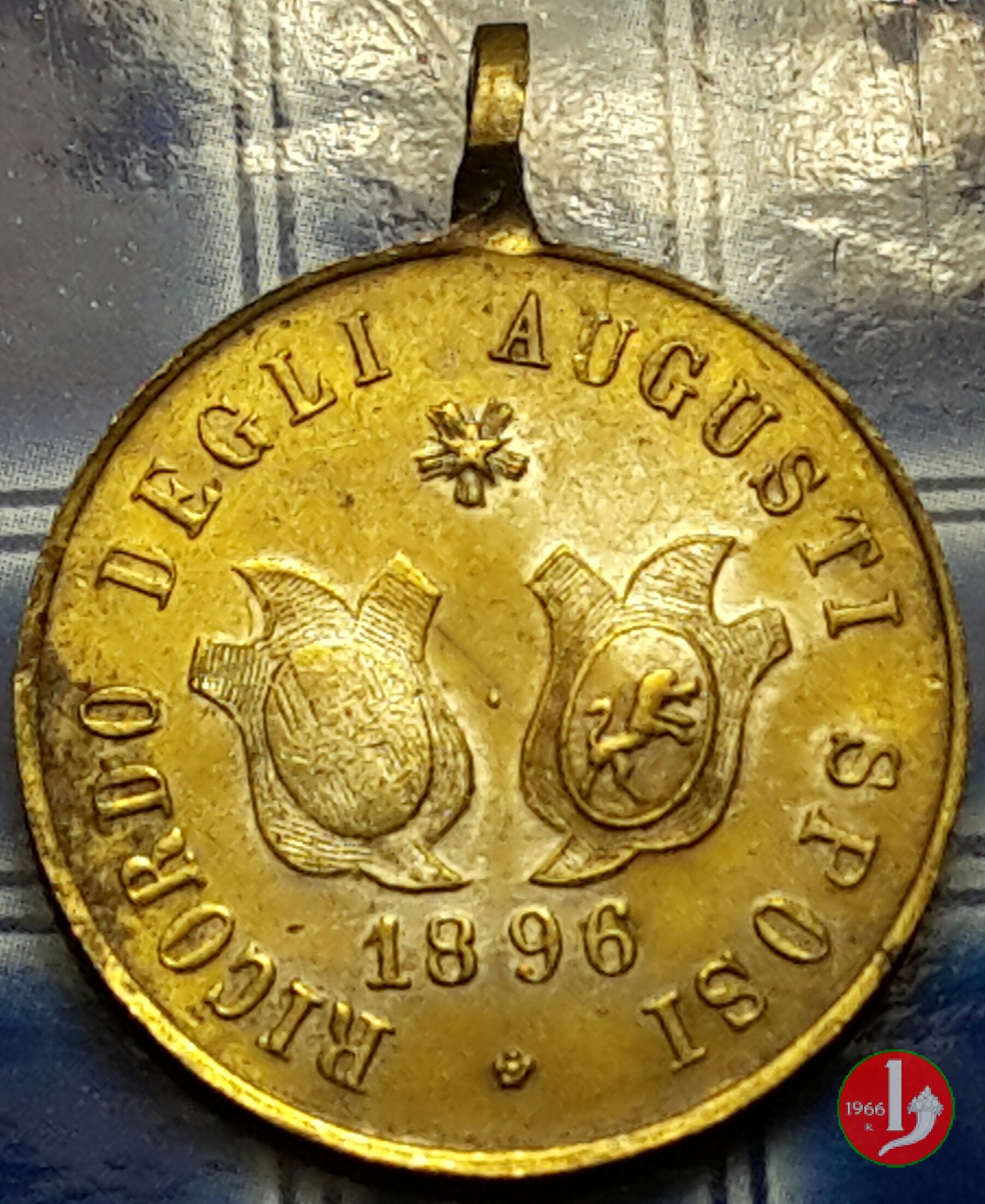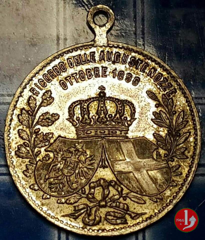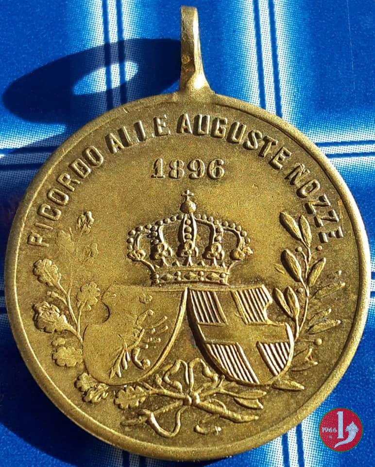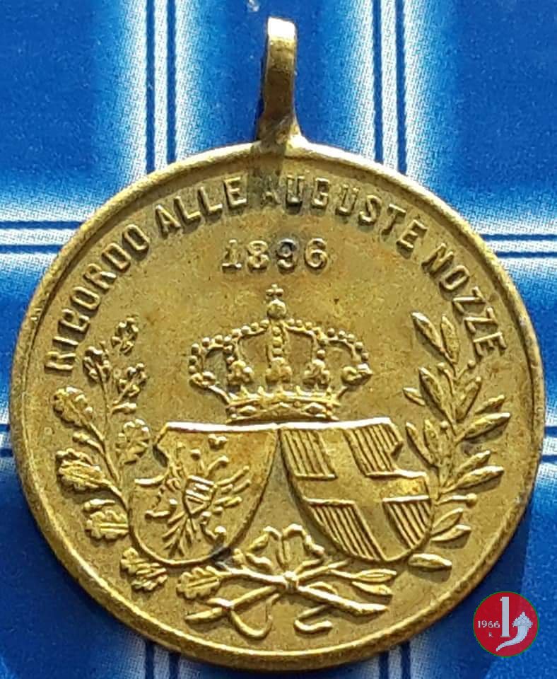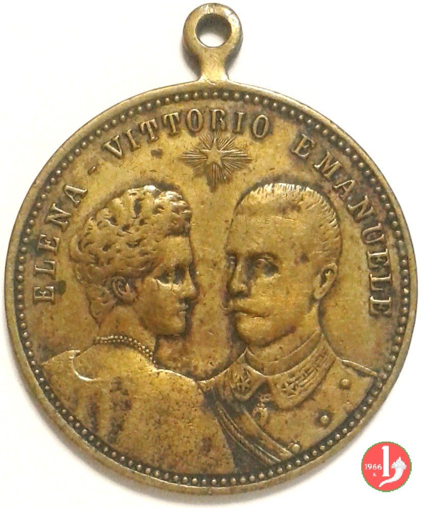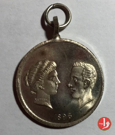 Vittorio Emanuele e Elena del Montenegro Affrontati 1896 Dritto: busti affrontati di Elena del Montenegro con capelli raccolti e doppia collana di perle e di Vittorio Emanuele con divisa militare, sormontati da corona e sopra a rami d'alloro fermati da margherita al centro Verso: RICORDO DEGLI AUGUSTI SPOSI * stemmi affiancati entro cartigli, sormontati da margherita sotto, entro targa: 1896 | |