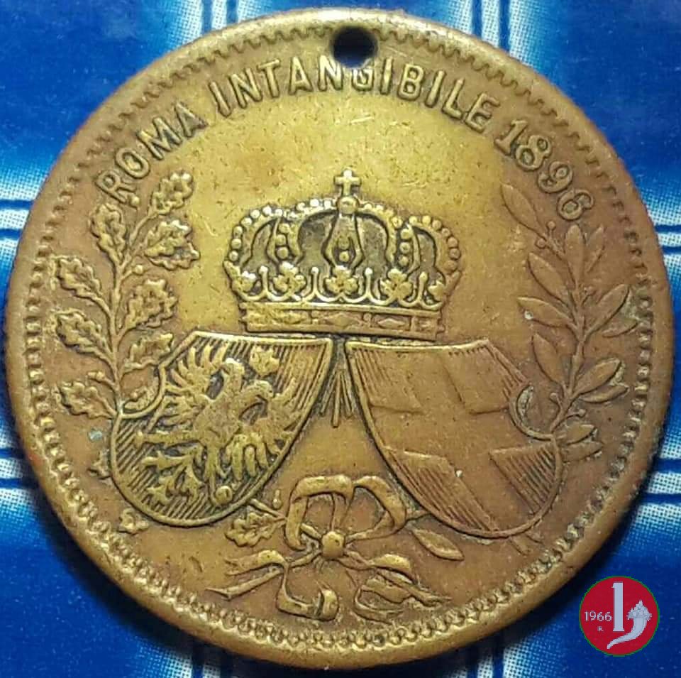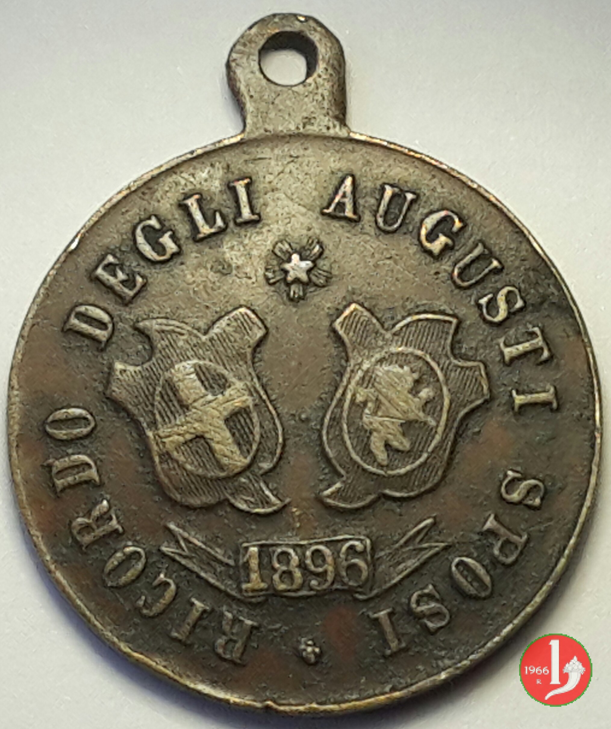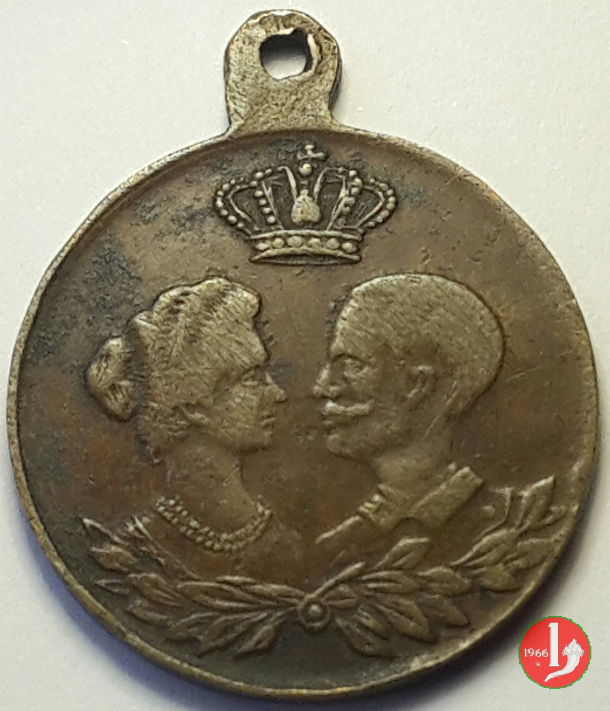 Vittorio Emanuele e Elena del Montenegro Affrontati 1896 Dritto: busti affrontati di Elena del Montenegro con capelli raccolti e doppia collana di perle e di Vittorio Emanuele con divisa militare, sormontati da corona e sopra a rami d'alloro fermati da margherita al centro Verso: RICORDO DEGLI AUGUSTI SPOSI * stemmi affiancati entro cartigli, sormontati da margherita sotto, entro targa: 1896 | |