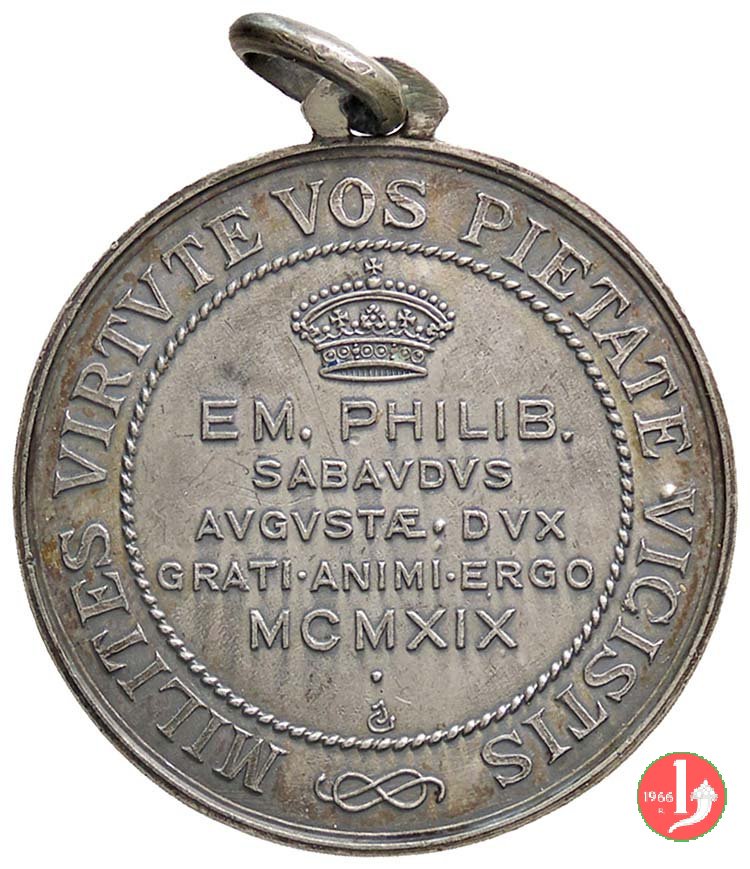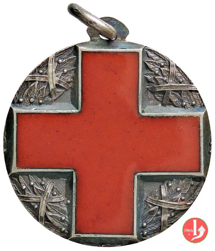 Croce Rossa a Emanuele Filiberto 1919 Dritto: Croce con smalti rossi su ghirlanda d'alloro con nastri incrociati Verso: MILITES VIRTVTE VOS PIETATE VICISTIS ![]() ![]() entro cerchio a festone e sormontata da corona ducale: EM. PHILIB. = SABAVDVS = AVGVSTAE. DVX = GRATI • ANIMI • ERGO = MCMXIX = • = FG (monogramma) | |