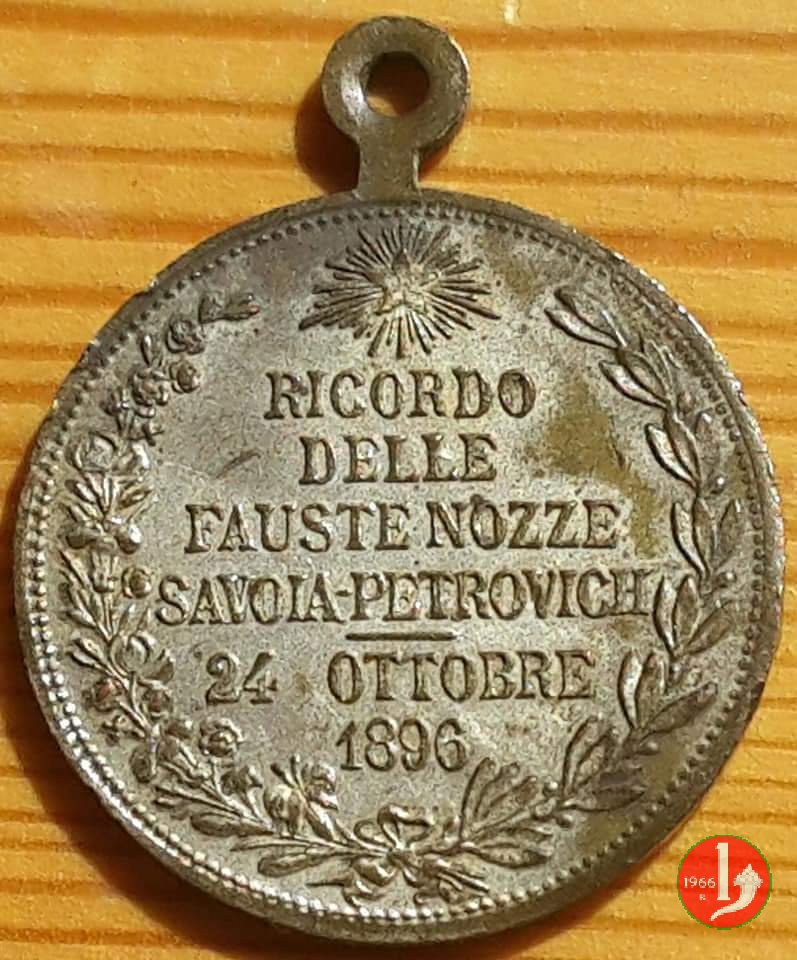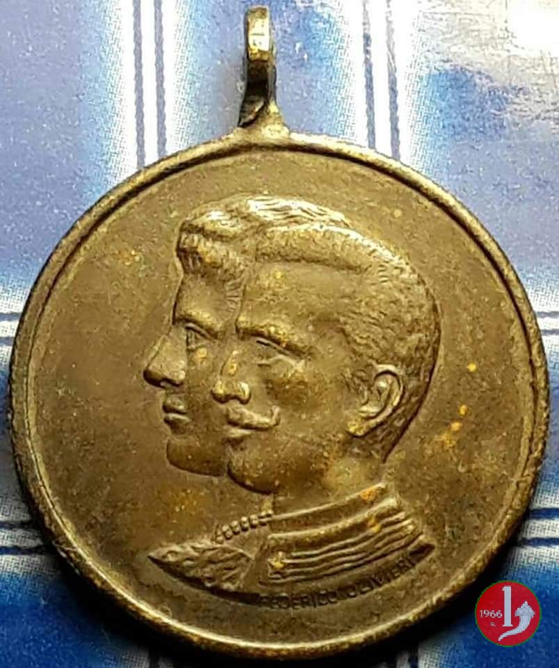 Vittorio Emanuele e Elena del Montenegro Affrontati 1896 Dritto: busti affrontati di Elena del Montenegro con capelli raccolti e doppia collana di perle e di Vittorio Emanuele con divisa militare, sormontati da stella raggiante e sopra a rami d'alloro fermati da bottone al centro Verso: RICORDO DEGLI AUGUSTI SPOSI * stemmi affiancati entro cartigli, sormontati da stella raggiante sotto: 1896 | |