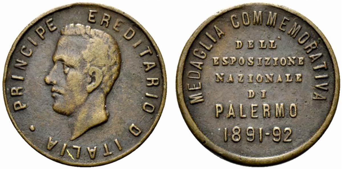 Esposizione di Palermo 1892 Dritto: PRINCIPE EREDITARIO D'ITALIA • testa a sx nel campo: DELL' = ESPOSIZIONE = NAZIONALE = DI = PALERMO = 1891-92 | |