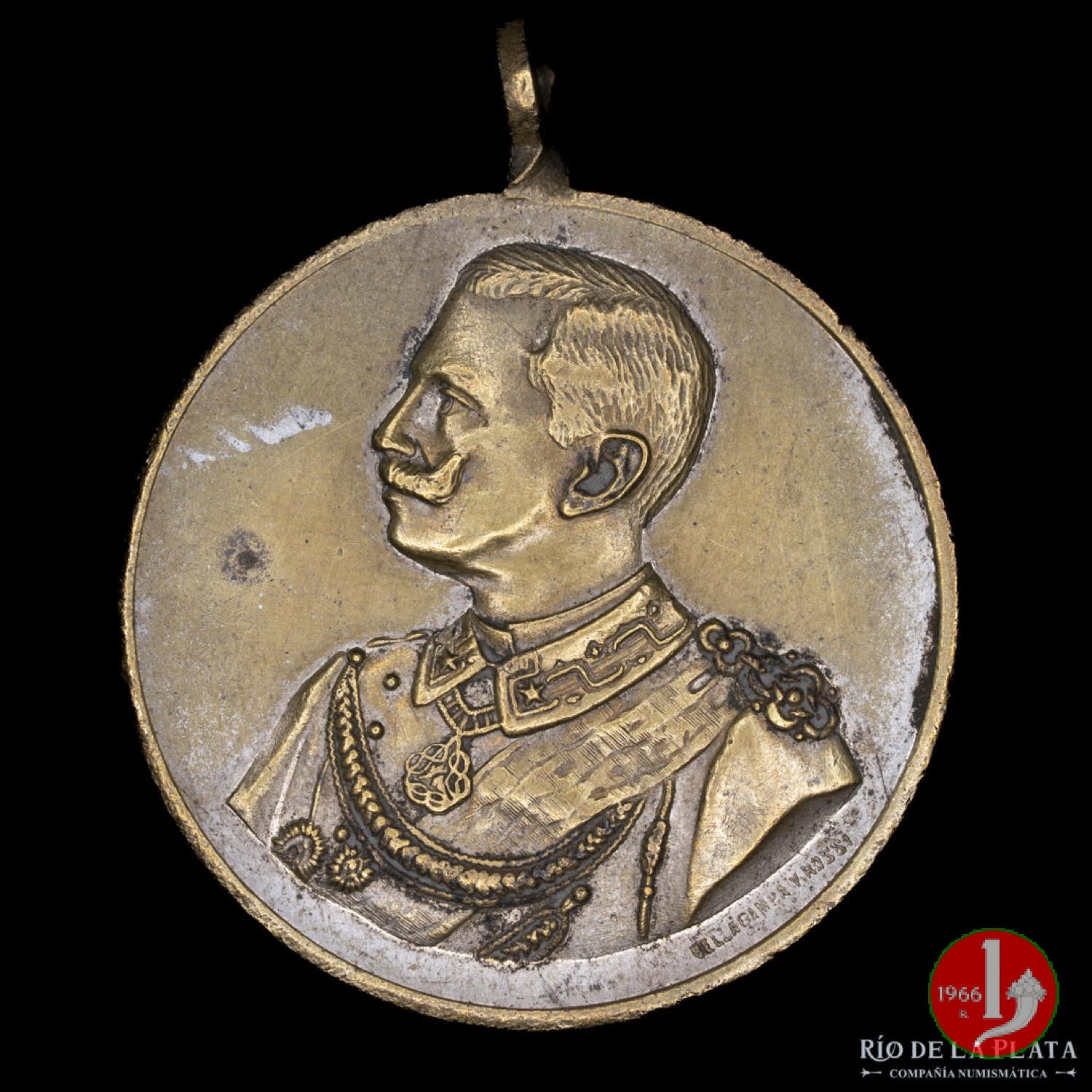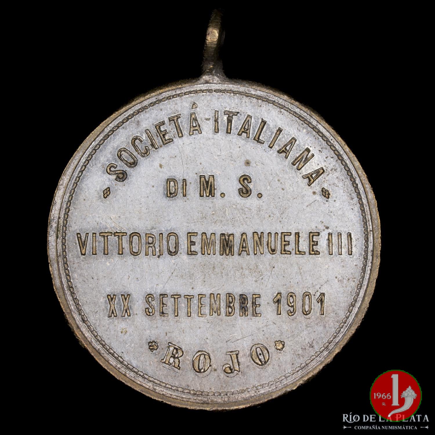 Società Italiana di Mutuo Soccorso di Rojo 1901 Dritto: busto di Vittorio Emanuele III a sx con divisa militare, decorazioni, fascia e collare della SS. Annunziata in basso a dx: BELLEGAMBA Y ROSSI nel campo: DI M. S. = VITTORIO EMANUELE III = 20 SETTEMBRE 1901 in basso circolarmente: * ROJO * | |