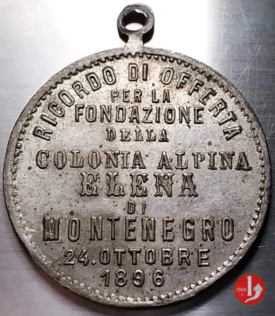 Nozze con Elena del Montenegro - Colonia Alpina 1896 Dritto: ELENA - VITTORIO EMANUELE busti affrontati e sormontati da stella raggiante di Elena con doppia collana di perle e di Vittorio Emanuele con divisa militare, fascia e collare della SS. Annunziata nel campo: PER LA = FONDAZIONE = DELLA = COLONIA ALPINA = ELENA = DI = MONTENEGRO = 24. OTTOBRE = 1896 stemmi coronati affiancati tra rami d'alloro e quercia legati in basso da nastro | |