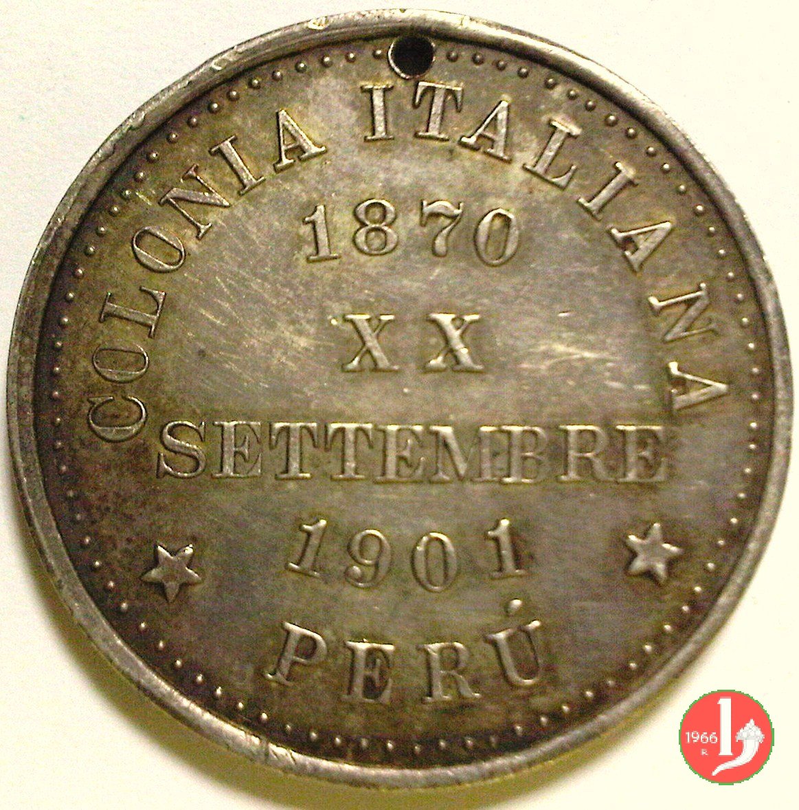 Colonia Italiana in Perú Dritto: tra rami d'alloro: busti affiancati a dx di Vittorio Emanuele III e della Regina Elena in alto: stella raggiante nel campo: 1870 = XX = SETTEMBRE = 1901 sotto: * PERU' * | |