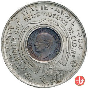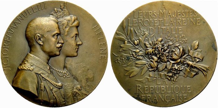 Visita dei Reali in Francia 14-10-1903 Dritto: VICTOR • EMANUEL • III _ HELENE • busti accollati a dx di Re Vittorio Emanuele con divisa militare e della Regine Elena con diadema e collana di perle sul taglio spalla: J.C. CHAPLAIN | |