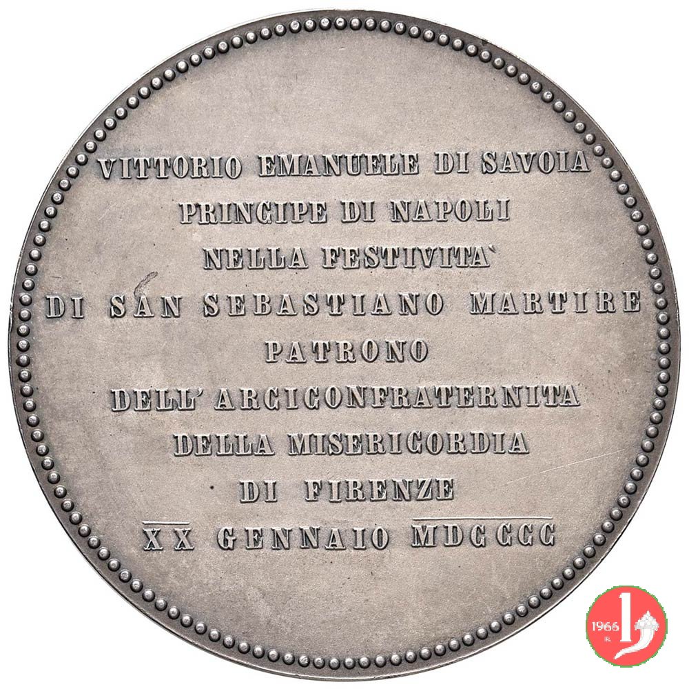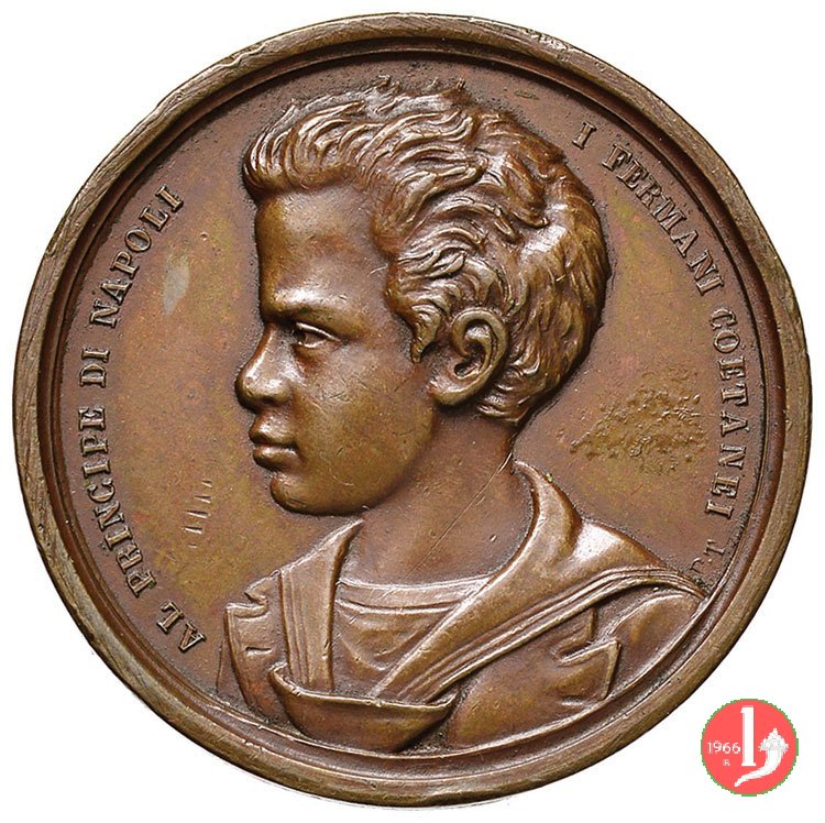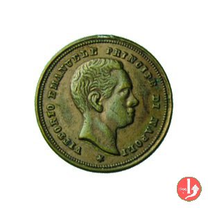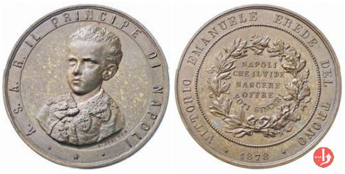 Napoli a S.A.R. Vittorio Emanuele 1878 Dritto: A. S. A. R. IL PRINCIPE DI NAPOLI • * • busto di 3/4 a sx con giacca dal bavero ricamato e decorazione in basso a dx: INSENGA nel campo entro cerchio perlinato e rami d'alloro e quercia legati in basso da nastro: NAPOLI = CHE IL VIDE = NASCERE = OFFRE = VOTI SINCERI | |