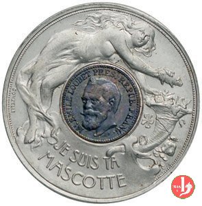 Visita del Presidente Francese Emile Loubet Dritto: nell'ampio bordo in Alluminio: figura muliebre, distesa in alto, deposita porcellino all'interno di cornucopia, a dx; in basso, entro cartella: JE SUIS TA = MASCOTTE a sx, presso il bordo: DONZELLI entro medaglia centrale: M. EMILE LOUBET PERS. REPUB. FRANC. testa di 3/4 a sx del Presidente Francese sotto: A.D ferro di cavallo (a controno della medaglia centrale) sotto: Stemmi affiancati nella medaglia centrale: VITTORIO EMANUELE III RE D'ITALIA testa a sx sotto: A.D | |