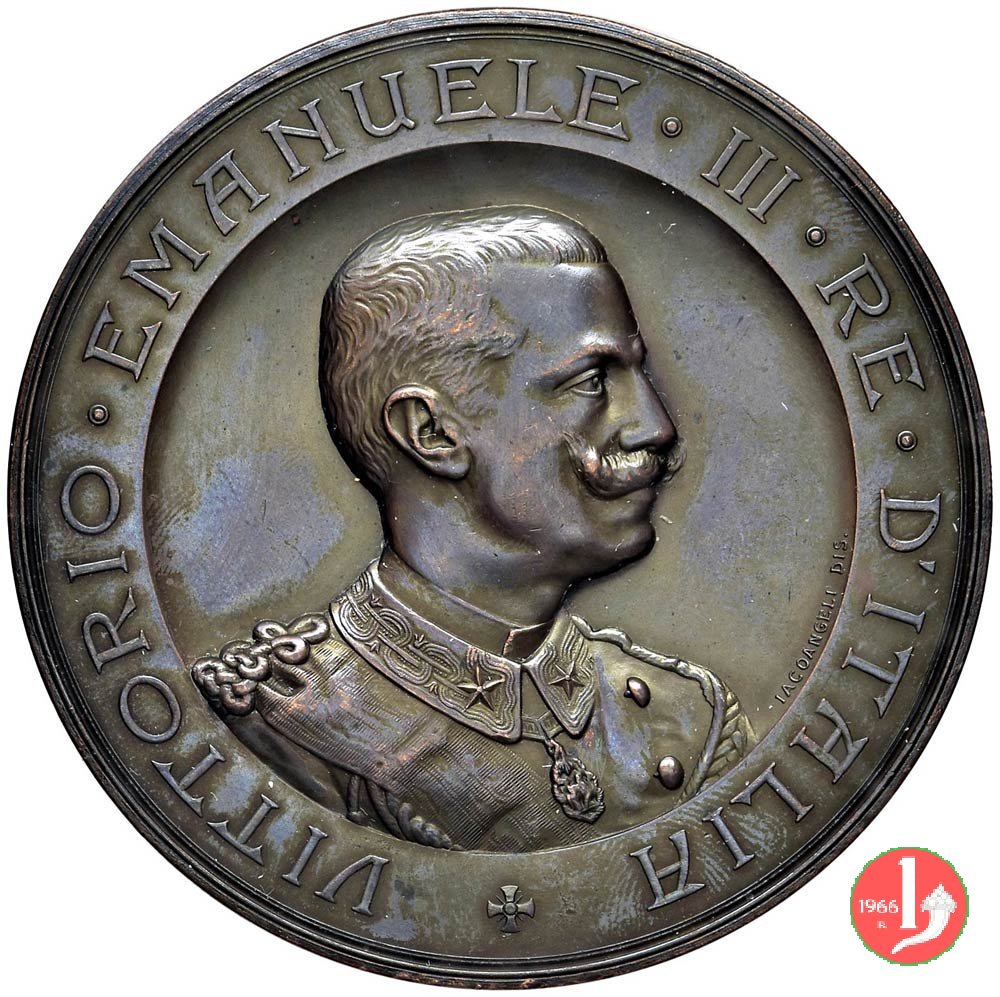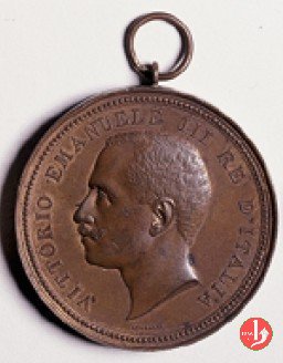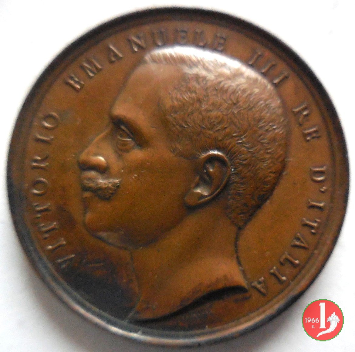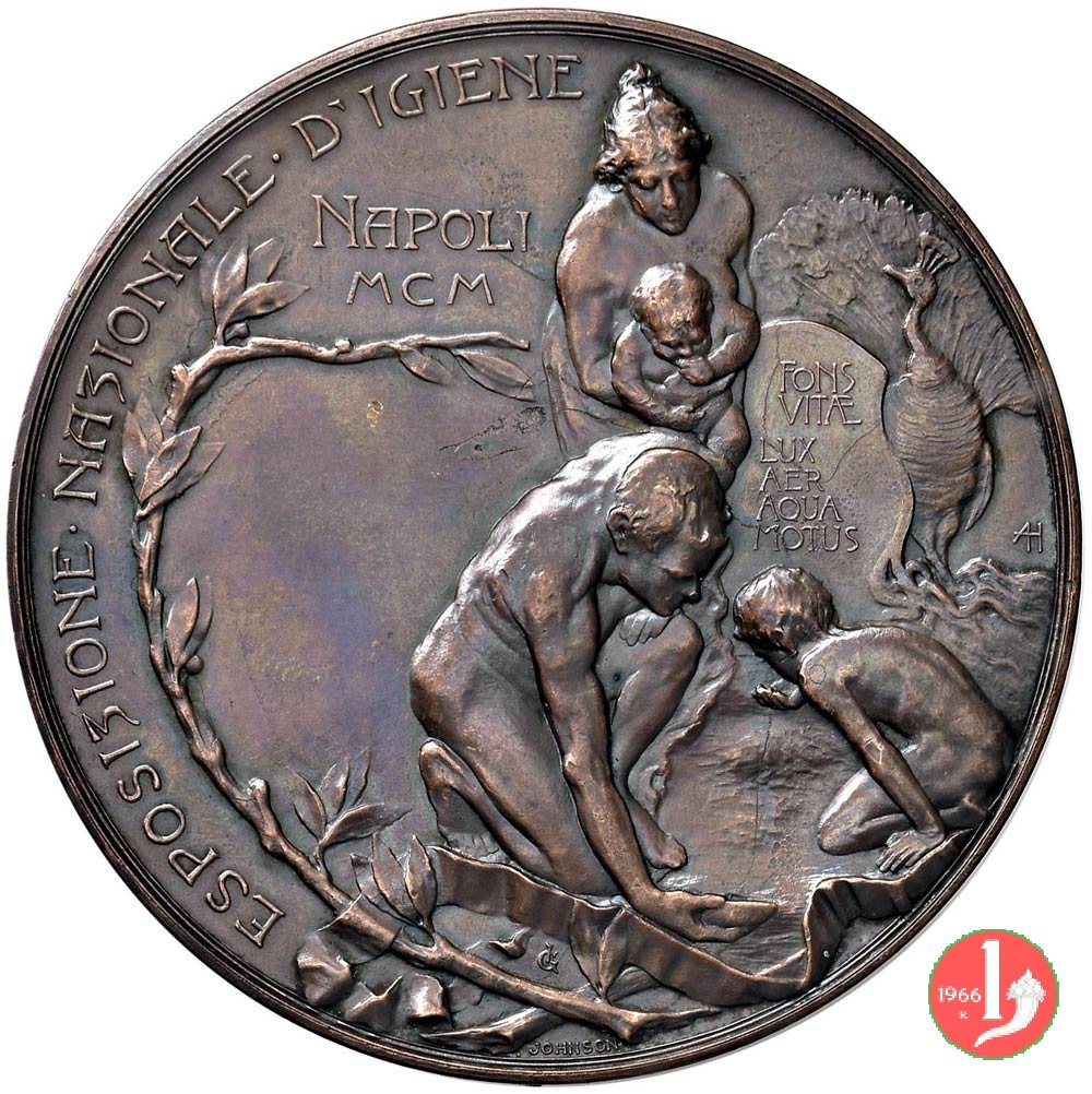 Esposizione Nazionale d'Igiene a Napoli Dritto: VITTORIO EMANUELE III RE D'ITALIA busto a dx con divisa militare e collare della Santissima Annunziata in piccolo: IACOANGELI DIS. nel campo: NAPOLI MCM Gruppo di persone attinge acqua da fonte; a sx ramo d'alloro sulla fontana: FONS = VITAE = LUX = AER = AQUA = MOTUS in piccolo: A.H. _ I.G. _ JOHNSON | |