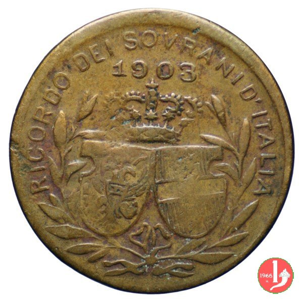 Ricordo dei Sovrani d'Italia Dritto: VIT. EMANUELE III _ ELENA DI MONTENEGRO busti affrontati sormontati da corona sotto: F. PONZI sotto: 1903 Stemmi affiancati e coronati su rami d'alloro legati in basso | |