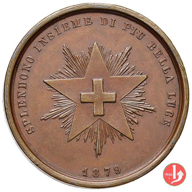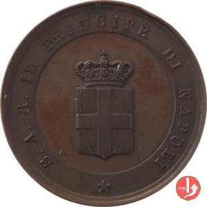 Al Principe di Napoli 1879 Dritto: AL PRINCIPE DI NAPOLI _ I FERMANI COETANEI busto a sx di Vittorio Emanuele con camicia "alla marinara" in basso a dx: P • T Croce su stella raggiante in basso: 1879 | |