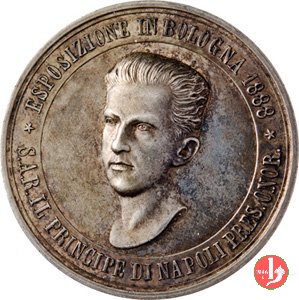 Premio Esposizione di Bologna 1888 Dritto: * ESPOSIZIONE IN BOLOGNA 1888 * = S. A. R. IL PRINCIPE DI NAPOLI PRES. ONOR. busto nudo di 3/4 a sx sul taglio sel busto: S.J | |