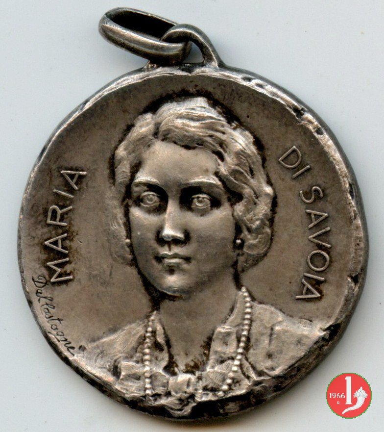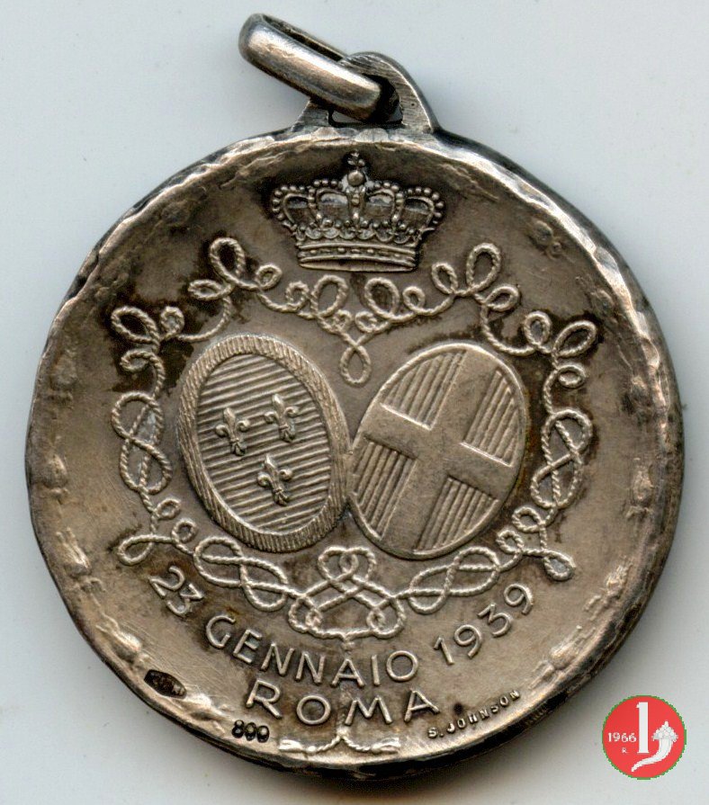 Matrimonio di Maria di Savoia 23-01-1939 Dritto: MARIA _ DI SAVOIA busto di fronte della Principessa a sx: DAL CASTAGNE' sotto: 23 GENNAIO 1939 = ROMA in basso a dx: S • JOHNSON | |