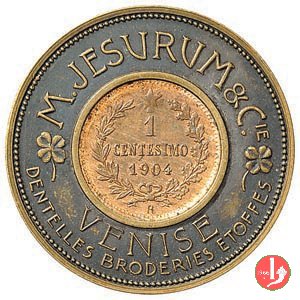 Gettone - M. Jesurum e C. Venezia Dritto: PORTE BONHEUR = ![]() SOUVENIR ![]() ![]() entro ferro di cavallo: moneta da un centesimo 1904 entro cerchio continuo: moneta da un centesimo 1904 in basso, circolarmente: VENISE = DENTELLES BRODERIES ETOFFES | |