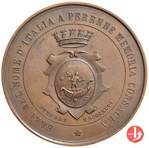 Nozze con Elena del Montenegro - Bari 1896 Dritto: DUE FEDI DUE GENTI DUE FORTUNE busti accollati a sx di Elena del Montenegro con tripla collana di perle e Vittorio Emanuele con divisa militare e collare della SS. Annunziata in basso, circolarmente: * CONGIUNTE * entro cerchio perlinato e in cartiglio: Stemma sormontato da corona turrita della Città di Bari sotto, ai lati del cartiglio: OTTOBRE _ MDCCCXCVI | |