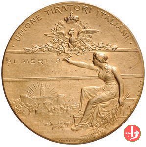 Al Merito Tiro a Segno Roma Dritto: IV CONGRESSO NAZIONALE DEL TIRO A SEGNO = ✠ ROMA 1904 ✠ testa a sx Aquila coronata su nastro in basso: figura femminile seduta a sx, scrive sul nastro AL MERITO e regge rami di palma sullo sfondo: il Campidoglio raggiante a dx, presso il bordo: A.P. DIS. in esergo: JOHNSON | |