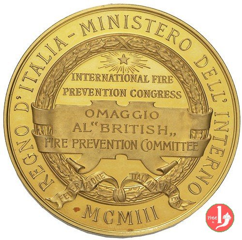 Omaggio al British Fire Prevention Committee Dritto: VITTORIO EMANUELE III RE D'ITALIA * testa a sx sotto: S • J in alto, entro ghirlanda d'allor fermata da nastri: stella raggiante = INTERNATIONAL FIRE = PREVENTION CONGRESS entro cartiglio: OMAGGIO = AL "BRITISH" = FIRE PREVENTION COMMITTEE sotto, su nastri svolazzanti: FEDRAZIONE _ ITALIANA POMPIERI in basso: MCMIII | |