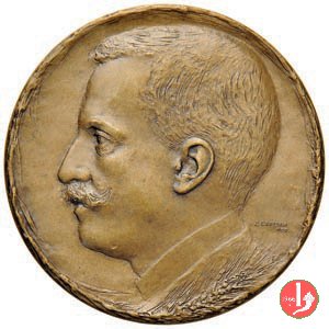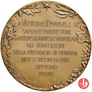 Agricoltori della Provincia di Novara Dritto: entro corona formata da spiga di grano: busto a sx di Vittorio Emanuele III nel campo, a dx: Z. CARESTIA = MOD. nel campo, tra nespole, spighe e tralci d'uva: A VITTORIO EMANVELE III° = SAPIENTE PROTETTORE = DEGL'INTERESSI AGRICOLI VNIVERSALI = GLI AGRICOLTORI = DELLA PROVINCIA DI NOVARA = DEVOTI RICONOSCENTI = OFFRONO = MCMV | |