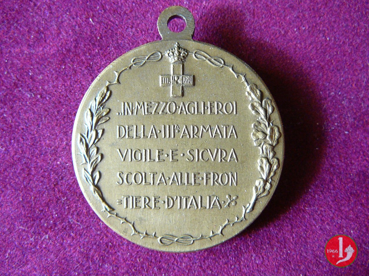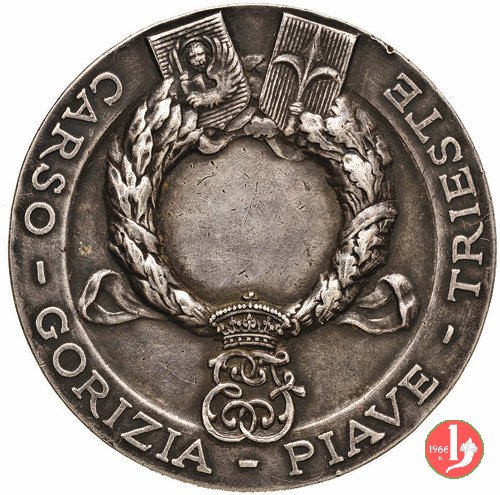 Emanuele Filiberto di Savoia-Aosta - Terza Armata Dritto: EMANVEL PHILIBERTVS SAB • AVGVSTAE DVX • busto elmato a sx con aquila sull'elmo, regge spada in basso, a sx: Z coronata Stemma delle Venezie (scudetto con leone di San Marco) e del Friuli (scudetto con alabarda di Trieste) su ghirlanda d'alloro fermata in basso dal monogramma coronato del Duca Emanuele Filiberto ( detto l'Invitto) | |