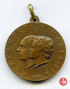Nozze Maria Pia-Alessandro Karadordevic 1955 Dritto: ALEXANDER • ET • MARIA • PIA ![]() ![]() testa accollate a sx sotto: GIAMPAOLI in basso, a dx: S.J. Stemma coronato bipartito tra nastri sotto: PRID • ID • FEBR = A • D • MCMLV | |