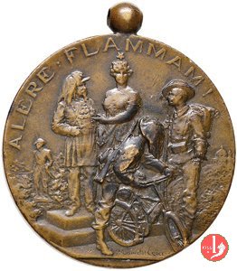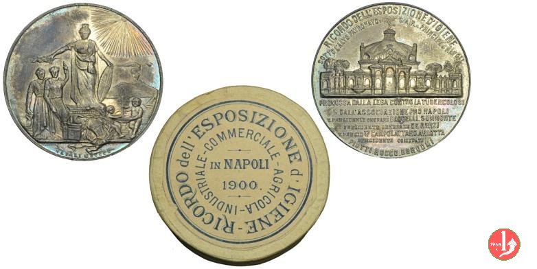 Esposizione d'Igiene a Napoli 1900 Dritto: la figura allegorica di Napoli turrita e su base, in piedi e di fronte, regge scudo e serto d'alloro che protende a sx, sul capo di due donne; a dx due putti giocano con fontana e sullo sfondo il Vesuvio fumante; in basso, presso la base Stemma Savoia crociato su serto d'alloro in esergo: NATALI MDCCCC in alto, sulla seconda riga: SOTTO L' ALTO PATRONATO DI _ S. A. R. IL PRINCIPE DI NAPOLI Prospetto anteriore del Padiglione Espositivo in esergo: PROMOSSA DALLA LEGA CONTRO LA TUBERCOLOSI = E DALL'ASSOCIAZIONE PRO NAPOLI =...BACELLI SUMMONTE =...BENZI =...CAMPOLATTAR CARLOTTA = PRESIDENTE COMITATO in basso, circolarmente: PIUTTI ROCCO BERGOMI | |