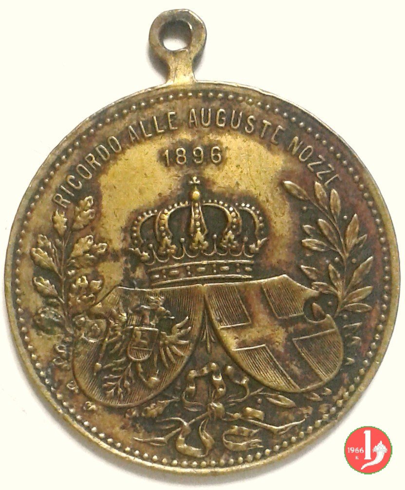 Nozze con Elena del Montenegro 1896 Dritto: teste affrontate della Principessa Elena del Montenegro con doppia collana di perle e del Principe Vittorio Emanuele, sormontate da stella raggiante Verso: RICORDO ALLE AUGUSTE NOZZE = 1896 stemmi coronati affiancati tra rami d'alloro e quercia legati in basso da nastro | |