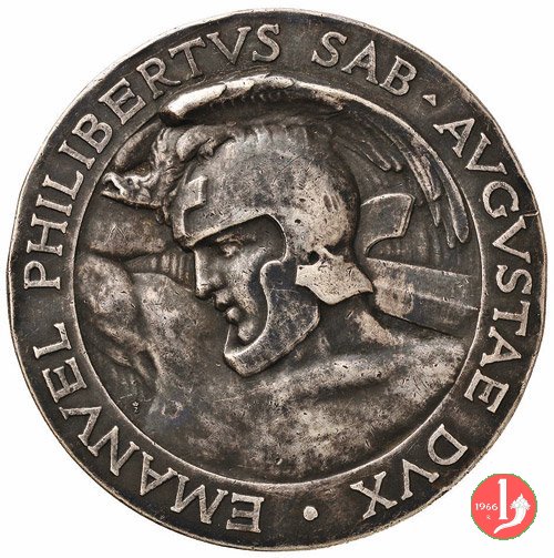 400° Morte di Emanuele Filiberto 1980 Dritto: EMANUELE FILIBERTO DUCA DI SAVOIA nel cerchio interno: IV CENTENARIO _ DELLA MORTE busto a sx con armatura e collare della SS. Annunziata nel campo, a dx: MDLXXX = MCMLXXX in esergo: CX ANNO DI FONDAZIONE = DEI CITTADINI DELL'ORDINE = MDCCCLXX = MCMLXXX in basso a dx: TERUGGI nel campo: due leoni rampanti sorreggono lo stemma di Emanuele Filiberto sormontato da tre elmi in esergo: "...ED EGLI FU TUTTO IL NOSTRO POPOLO = QUANDO ESSO ERA IMMEMORE = DI SE MEDESIMO..." = EMANUELE FILIBERTO = DUCA D'AOSTA = MCMXXVIII = S. JOHNSON | |
