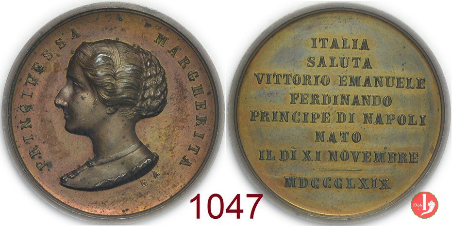 Nascita di Vittorio Emanuele 11-11-1869 Dritto: PRINCIPESSA _ MARGHERITA busto a sx con capelli raccolti in trecce sulla nuca, con nastri e collana con pendente sotto: G.A | |