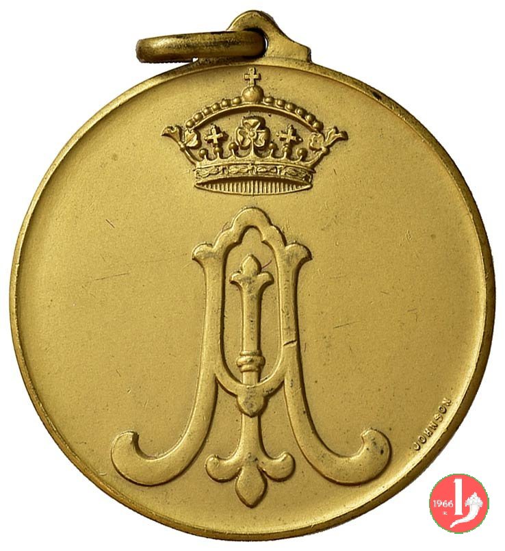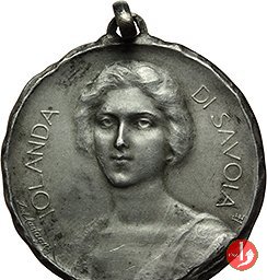 Matrimonio di Iolanda Margherita e Giorgio Carlo Calvi 1923 Dritto: IOLANDA _ DI SAVOIA busto di fronte della Principessa in basso, a sx: DAL CASTAGNE' in basso, a dx: FE sotto: 9 APRILE _ MCMXXIII = ROMA in basso, a dx: JOHNSON | |