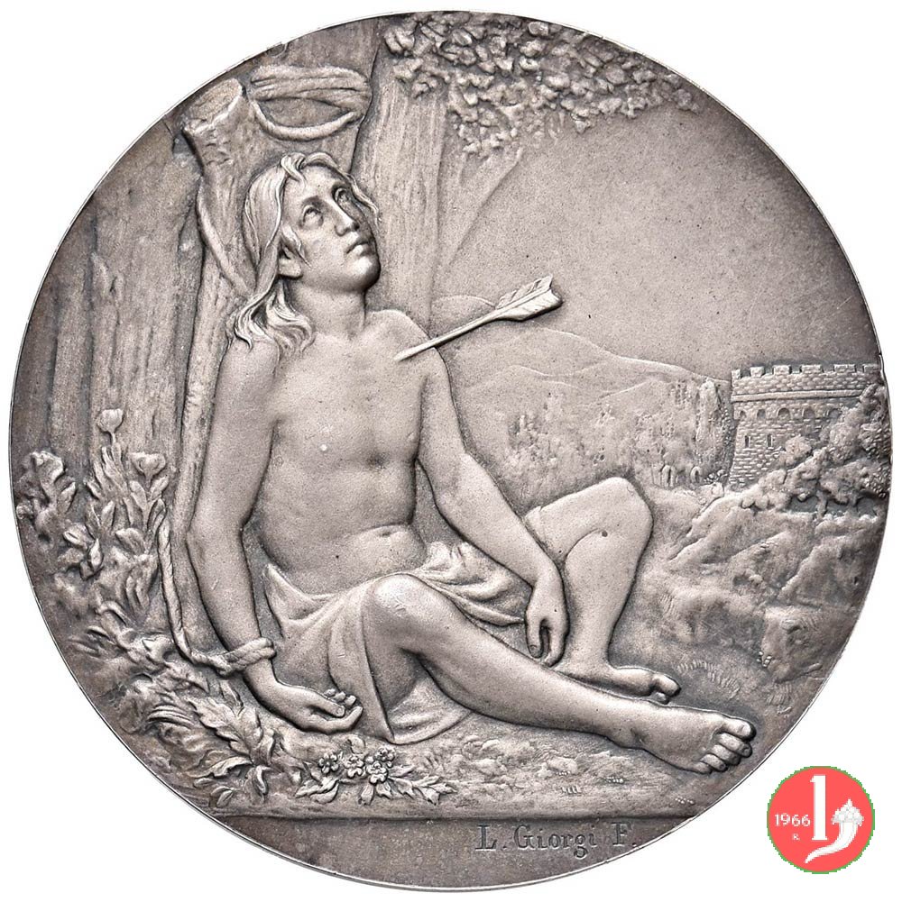 Arciconfraternita della Misericordia 1900 Dritto: San Sebastiano seduto di 3/4 a dx presso albero è trafitto da una freccia, sullo sfondo a dx fortezza in esergo: L. GIORGI F. | |