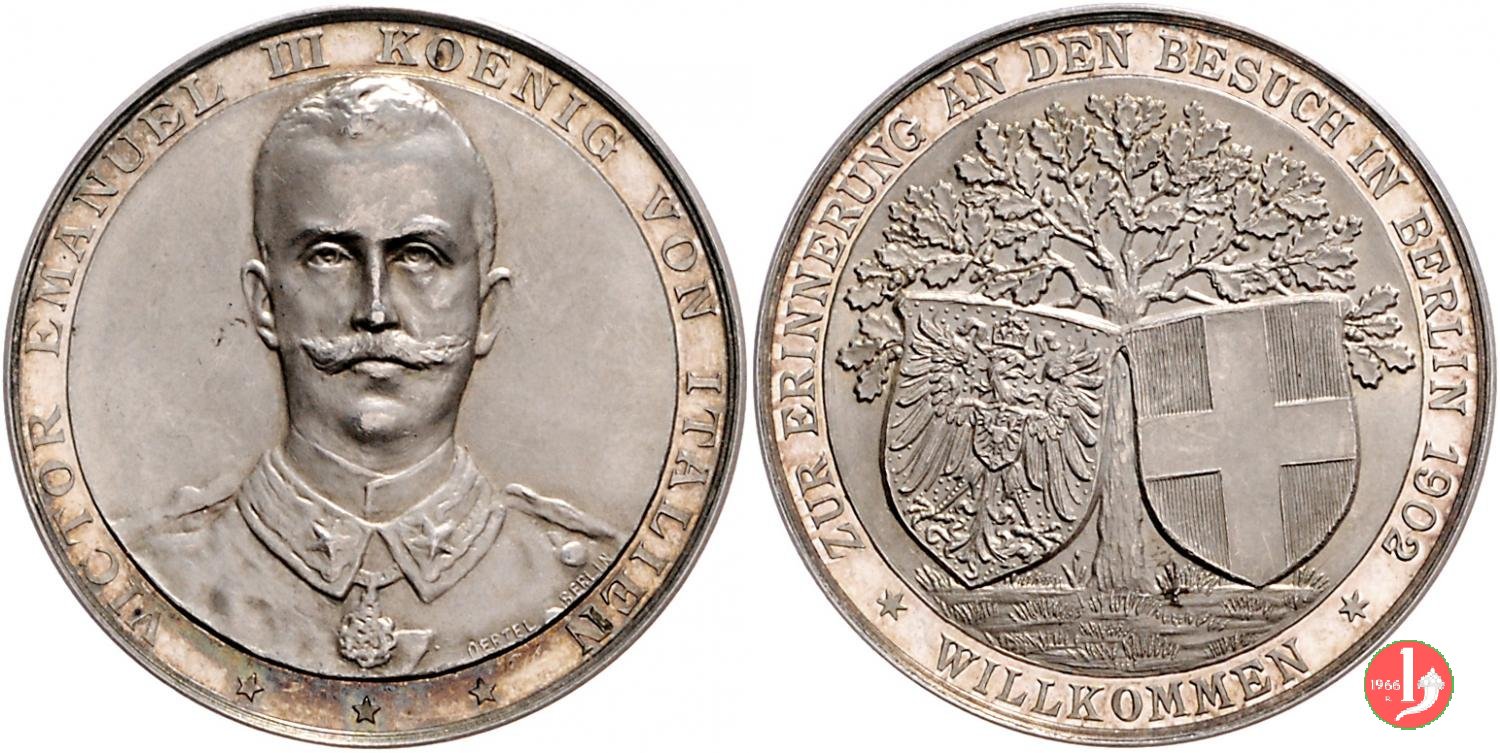 Viaggio a Berlino Dritto: VICTOR EMANUEL III. KONIG VON ITALIEN * * * busto di fronte in divisa e collare della Santissima Annunziata in basso, a dx, sul busto: OERTEL BERLIN Stemmi affiancati della Germani e dell'Italia (scudo Savoia), sullo sfondo albero di quercia | |