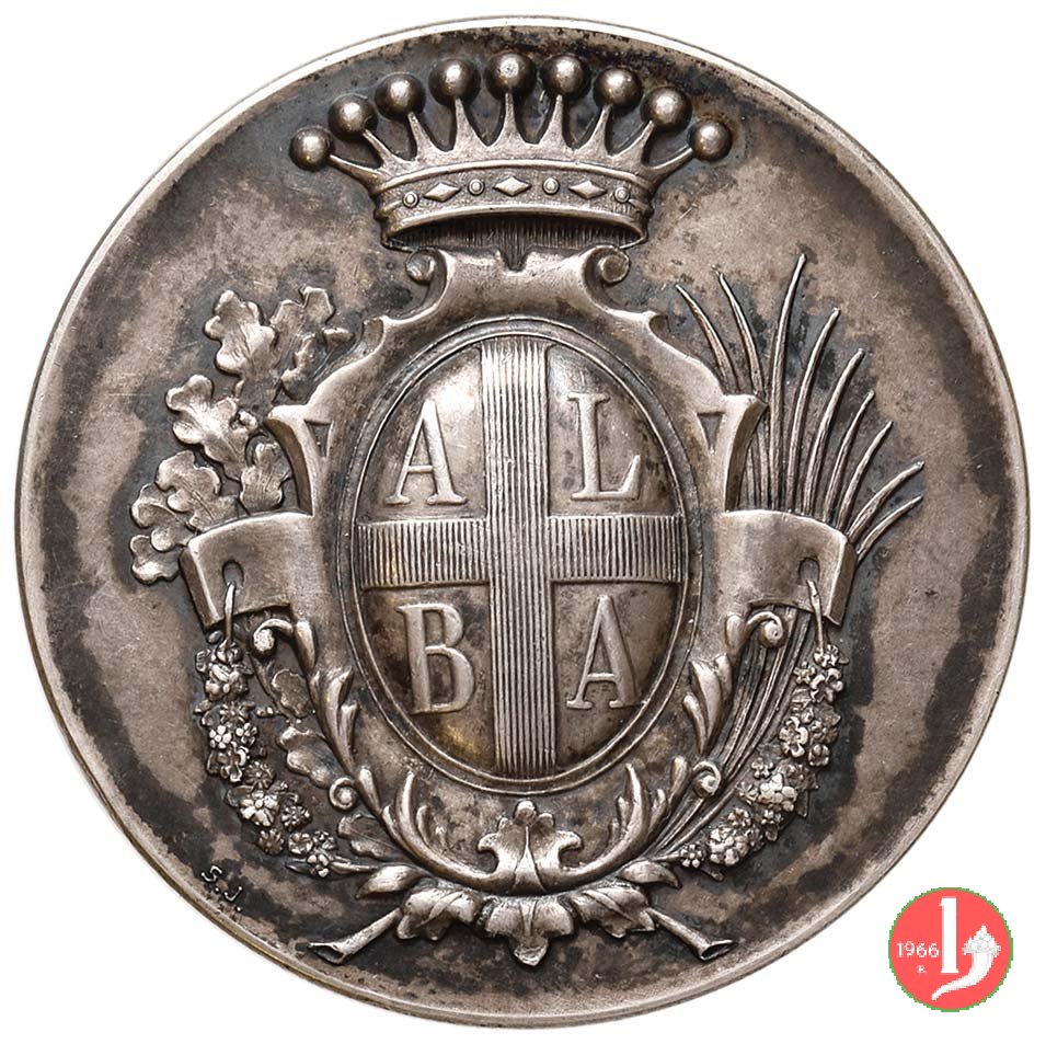 Esposizione Agricola Industriale Alba 1903 Dritto: Stemma coronato della Città di A _ L _ B _ A entro cartiglio ovale, tra festoni floreali e rami di quercia e palma in basso, a sx: S.J. in alto: ESPOSIZIONE = AGRICOLA = INDUSTRIALE in esergo: SOTTO _ L'ALTO _ PATRONATO = DI S.M. IL RE = - • - = ALBA 1903 | |