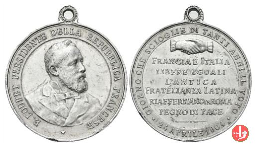 Émile Loubet - Francia e Italia Libere 24-04-1904 Dritto: E. LOUBET PRESIDENTE DELLA REPUBBLICA FRANCESE * entro cerchio continuo: busto a dx con giacca, camicia e papillon nel campo sotto a mani che si stringono: FRANCIA E ITALIA = LIBERE UGUALI = L'ANTICA = FRATELLANZA LATINA = RIAFFERMANO IN ROMA = PEGNO DI PACE = - • - | |