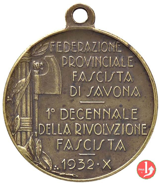 Reverse: nel campo: FEDERAZIONE = PROVINCIALE = FASCISTA = DI SAVONA = - = 1° DECENNALE = DELLA RIVOLVZIONE = FASCISTA = - = 1932 • X