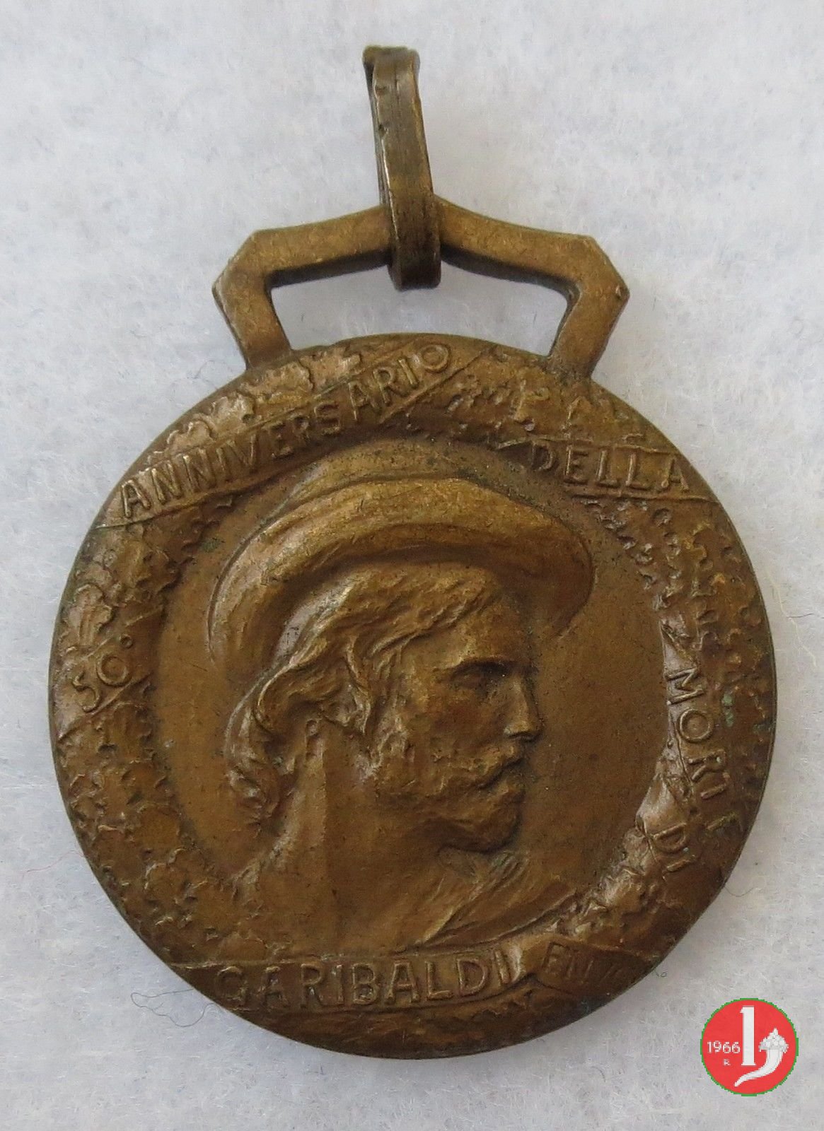 Dritto: entro nastro posto su ghirlanda d'alloro:50° _ ANNIVERSARIO _ DELLA _ MORTE _ DI _ GARIBALDI _ F.N.V.G.