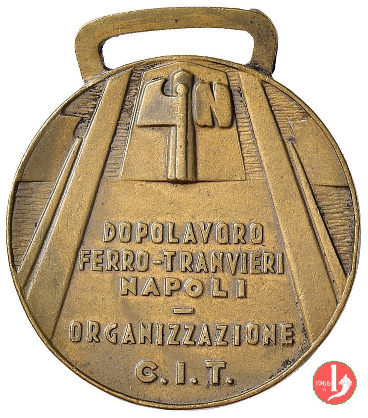 Dritto: tra fasci a lame divergenti e sotto a logo dell'OND - Dopolavoro: DOPOLAVORO = FERRO-TRANVIERI = NAPOLI = - = ORGANIZZAZIONE = C. I. T.