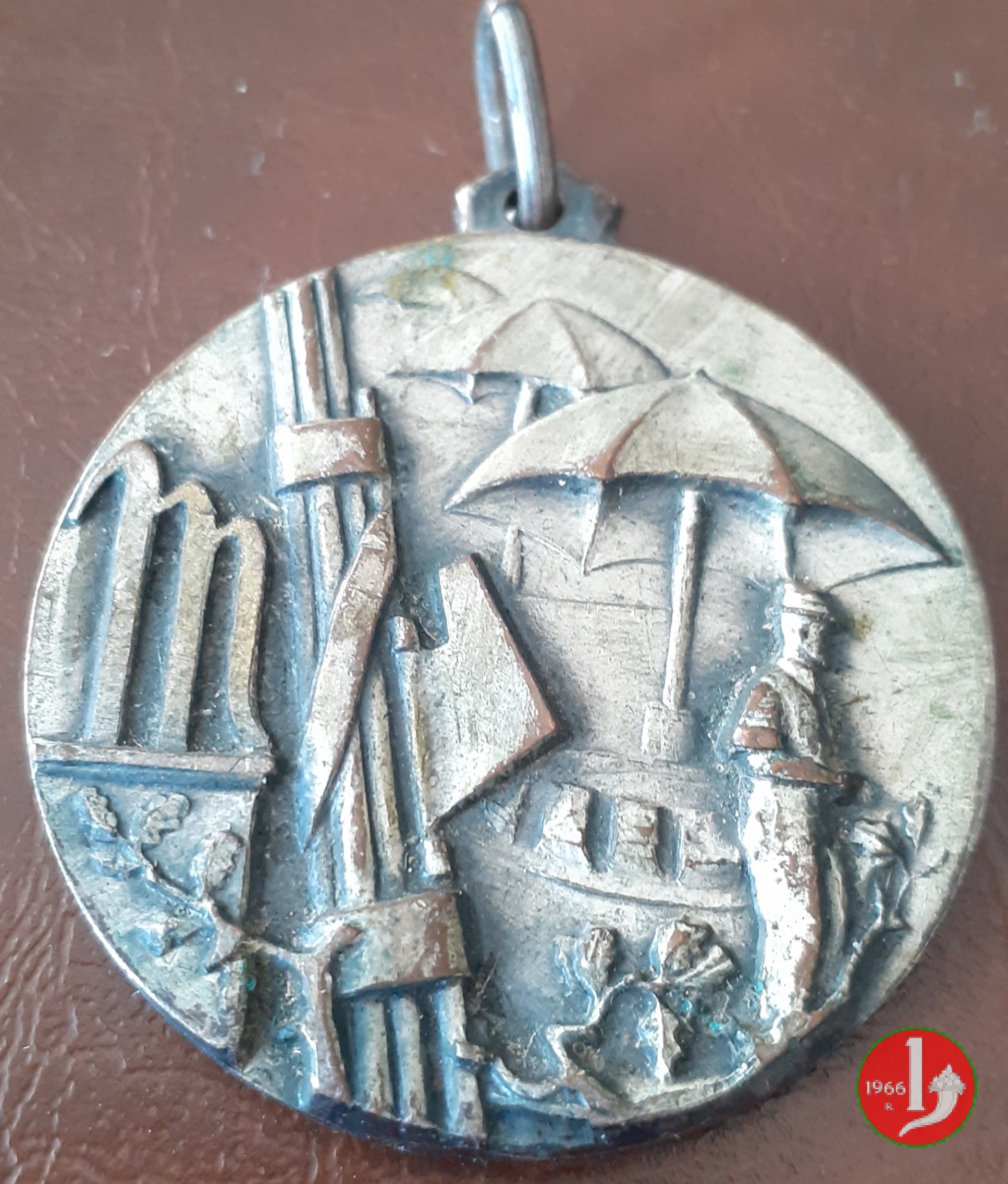Dritto: venditore ambulante, in piedi, volto a dx, presso ombrelloni aperti a sx: fascio diagonale e M (corsivo)