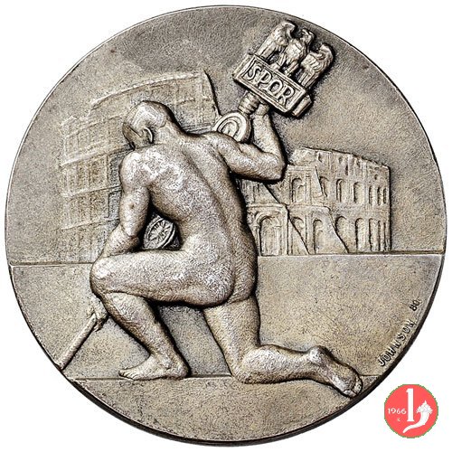 Verso: atleta in piedi, volto a sx, saluta con braccio, in basso fascio