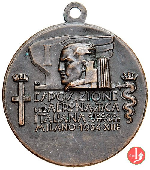 nel campo, tra gli stemmi coronati con scudo Milano e biscione: ESPOSIZIONE = DELL'AERONAVTICA = ITALIANA _ GIUGNO • = OTTOBRE • = MILANO • 1934 • XII EF