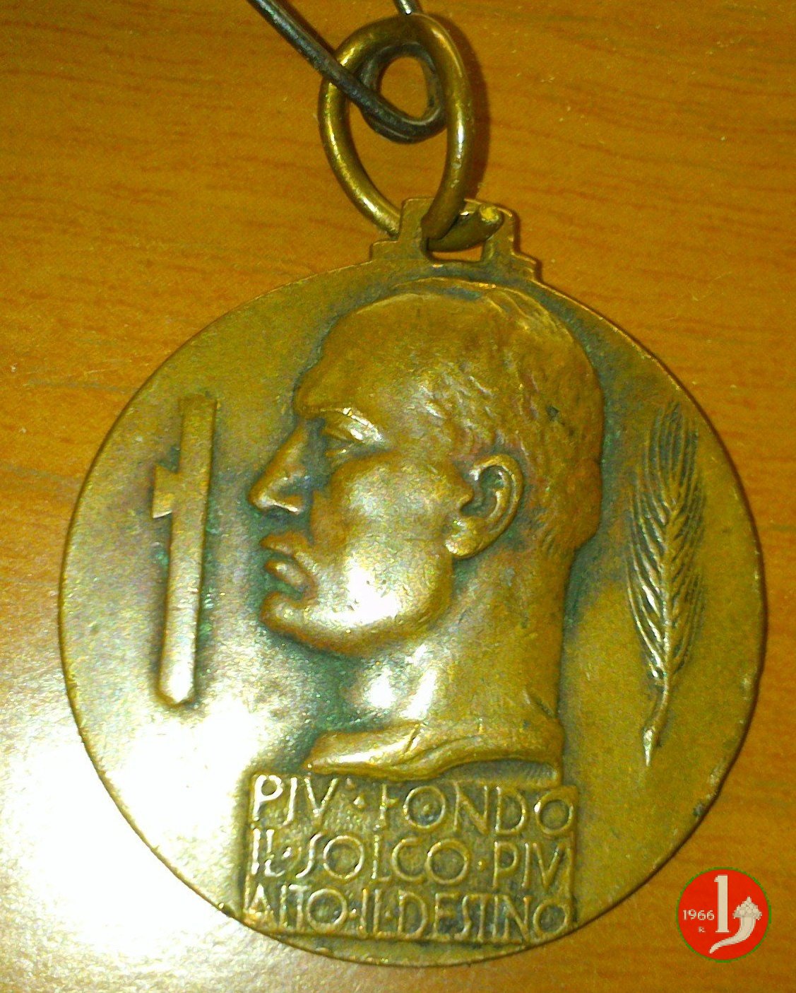 Dritto: tra fascio e spiga verticali: testa di Mussolini a sx