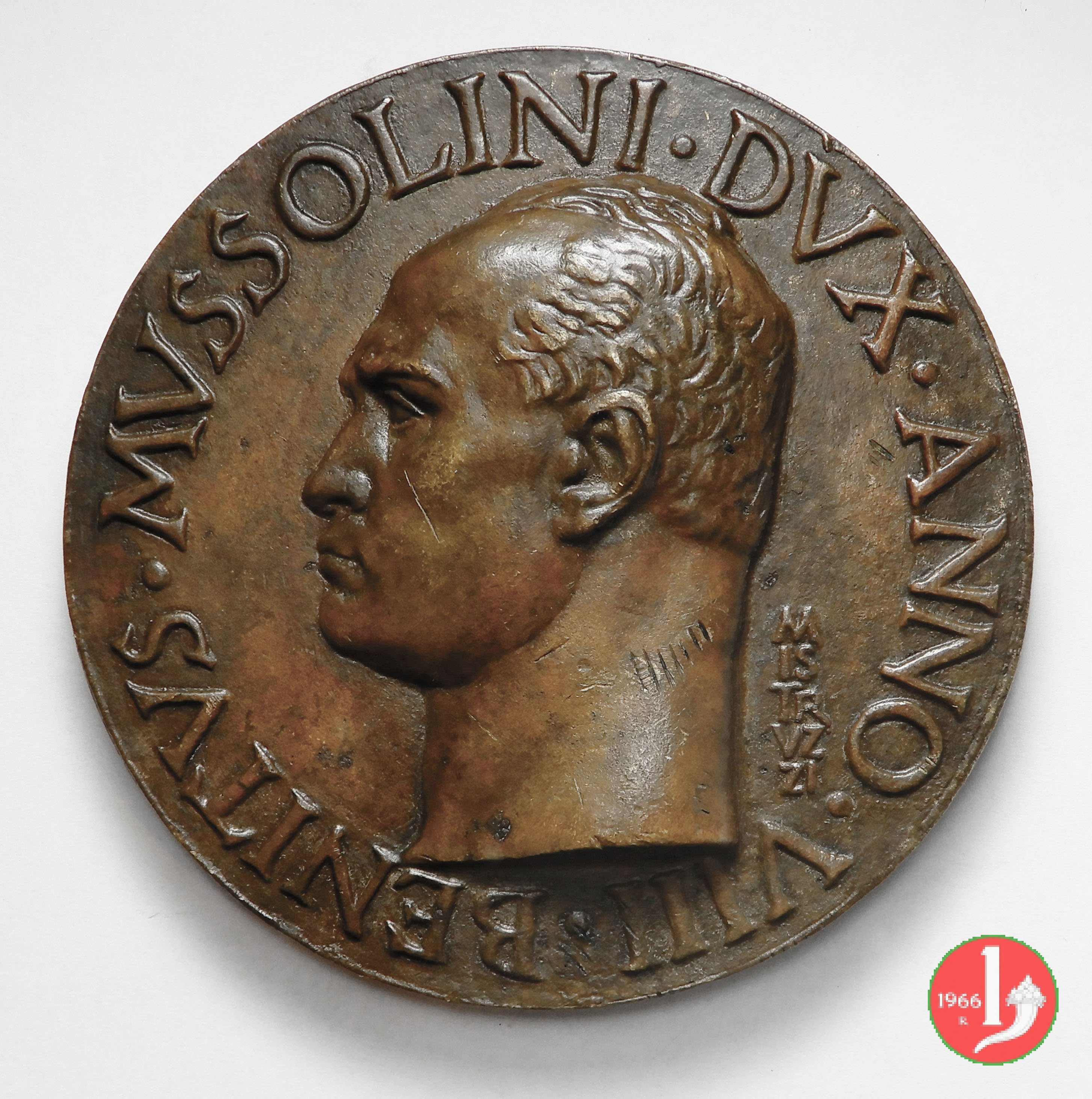 Benitus Mussolini Dux -C3 Obverse: BENITVS • MVSSOLINI • DVX • ANNO • VIII • testa a sx nel campo a dx: M = IS = TR = VZ = ZI figura virile a sx su imbarcazione con fascio in poppa ed aquila ad ali spiegate in esergo: MISTRVTII = OPVS | |