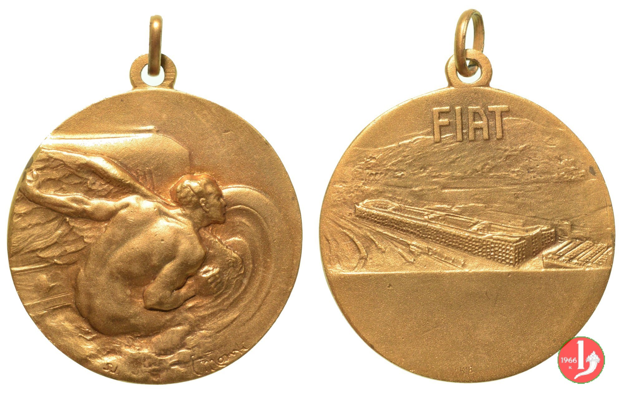 FIAT - Stabilimento del Lingotto -C86 Obverse: allegoria con figura maschile nuda e china verso dx che sorregge ala ancorata a ruota di auto in corsa in basso a dx: E. MONTI in basso a sx: S. JOHNSON (SJ) veduta dello Stabilimento Fiat del Lingotto con la pista di collaudo | |