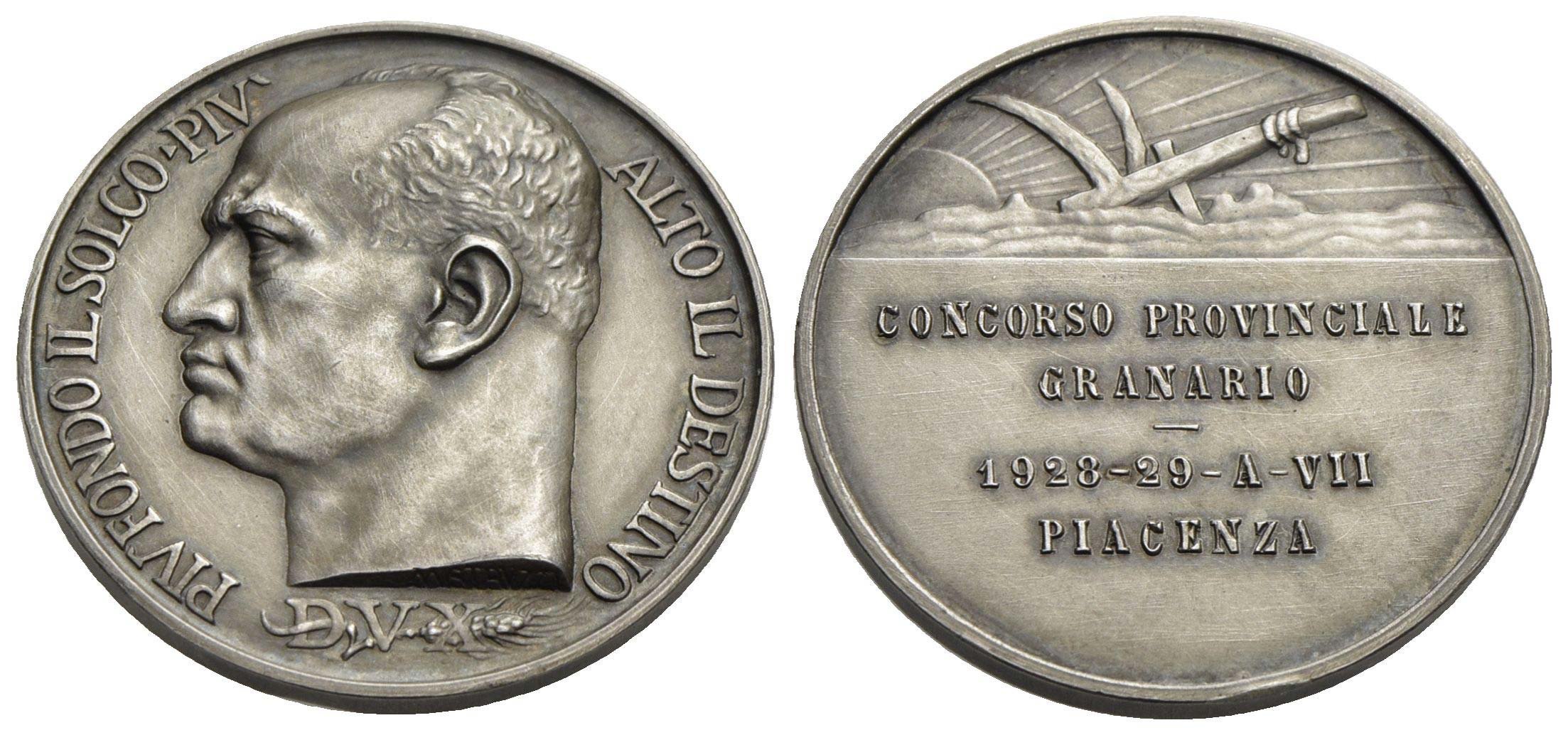 Battaglia del Grano Piacenza -C- Obverse: PIV' FONDO IL SOLCO • PIV' _ ALTO IL DESTINO testa di Mussolini a sx sul taglio del collo: MISTRVZZI sotto: DVX su spiga di grano nel campo: CONCORSO PROVINCIALE = GRANARIO = - = 1928-29-A-VII = PIACENZA | |