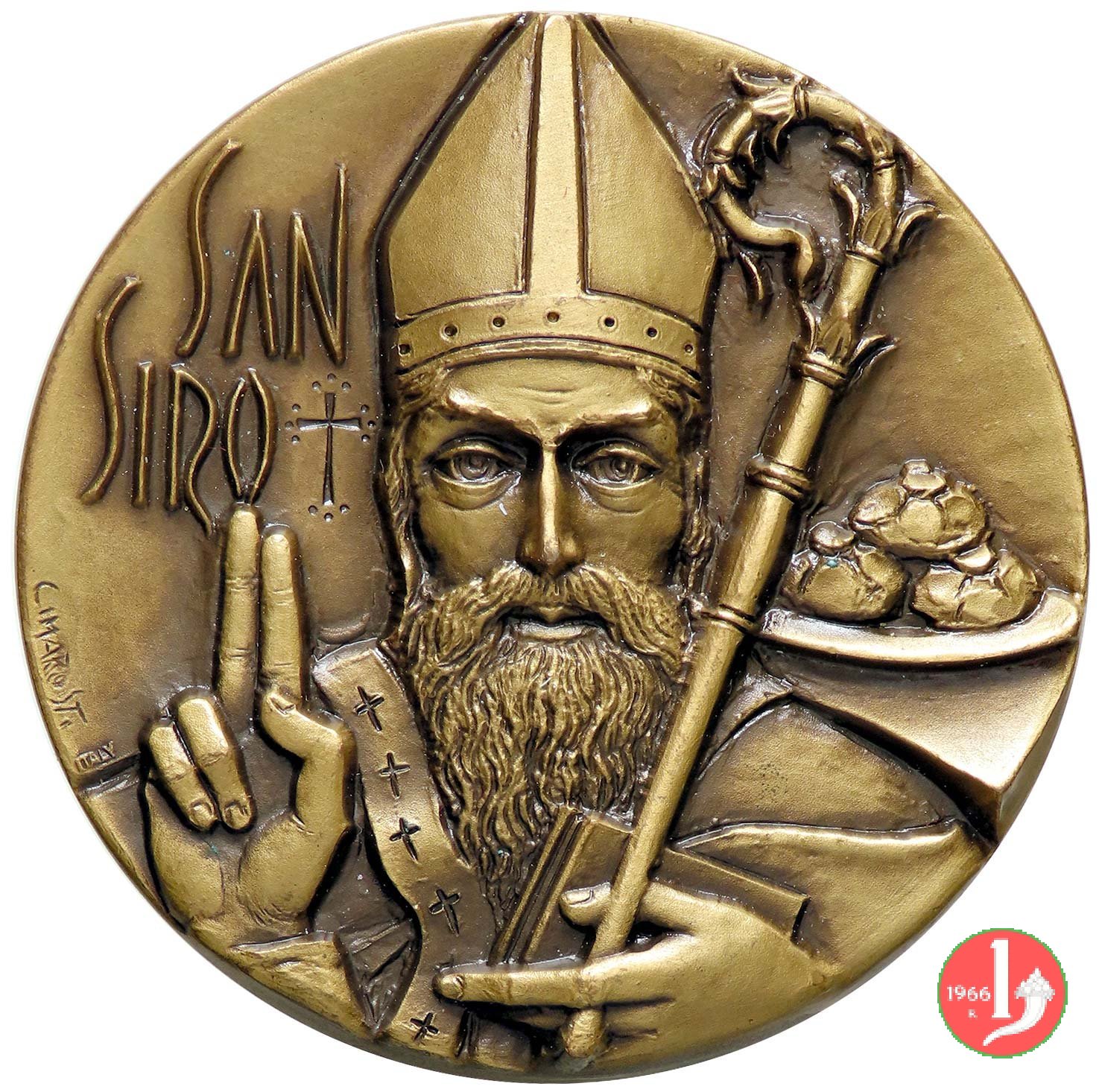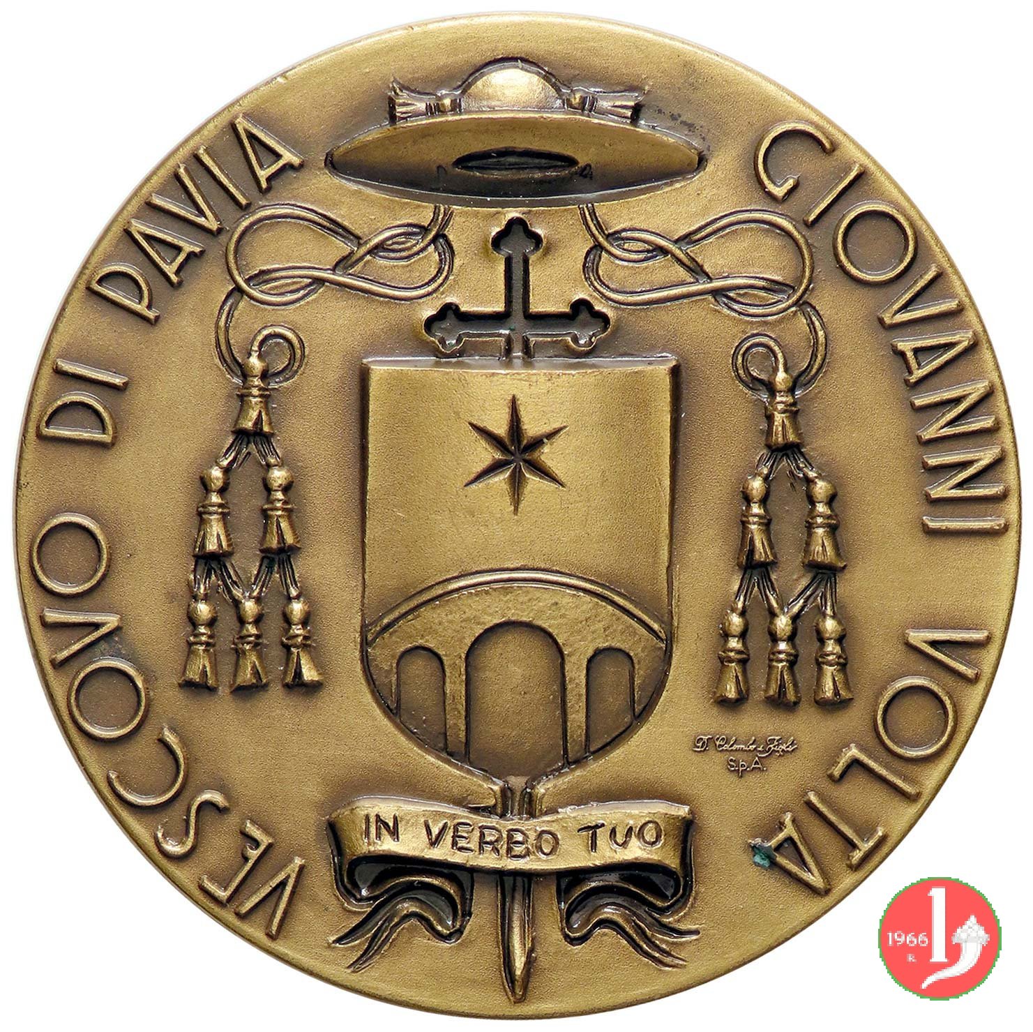 Giovanni Volta - Vescovo di Pavia (1986) Dritto: busto benedicente di fronte di San Siro con mitra, pallio, pianeta, Vangelo e pastorale; a dx piatto con pani nel campo a sx: SAN = SIRO ✠ in basso a sx: CIMAROSTI _ ITALY Stemma Vescovile sormontato da Croce e da galero a sei nodi (o nappe) su motto in nastro: IN VERBO TUO nel campo a dx: D. COLOMBO & FIGLI = S.P.A. | |